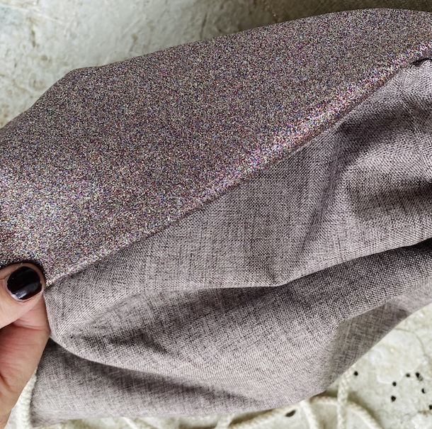 Disse ret fede muleposer har glimmer på hele den ene side, og på den anden side meleret stof tone i tone med glimmer siden.