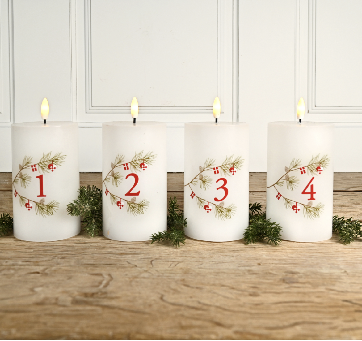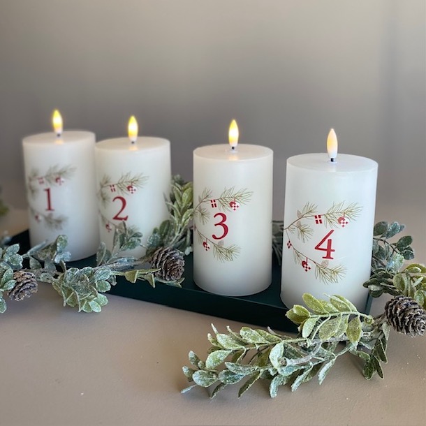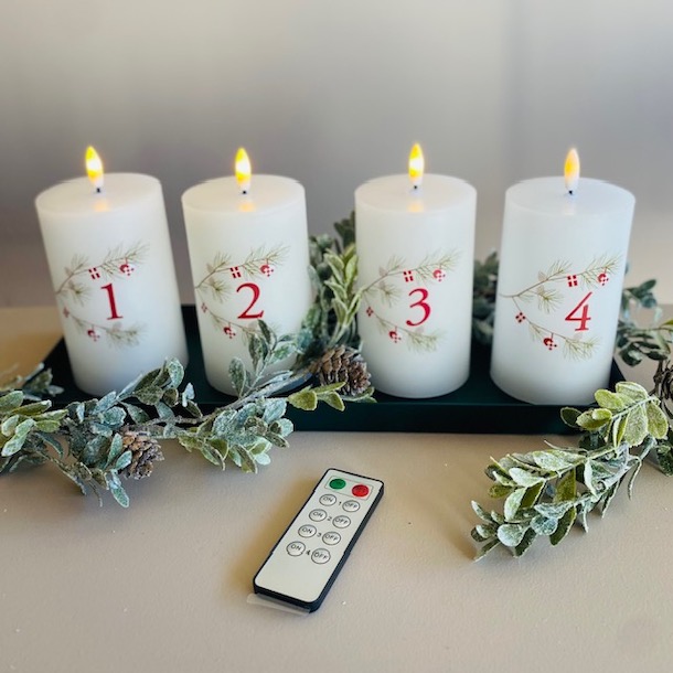 Flotte LED adventslys med tal 1-2-3-4 og en fin grangren med kogeler, flag og hjerter. Der med følger en fjernbetjening, så du kan tænde 1 af gangen og mulighed for at tænde alle på en gang.