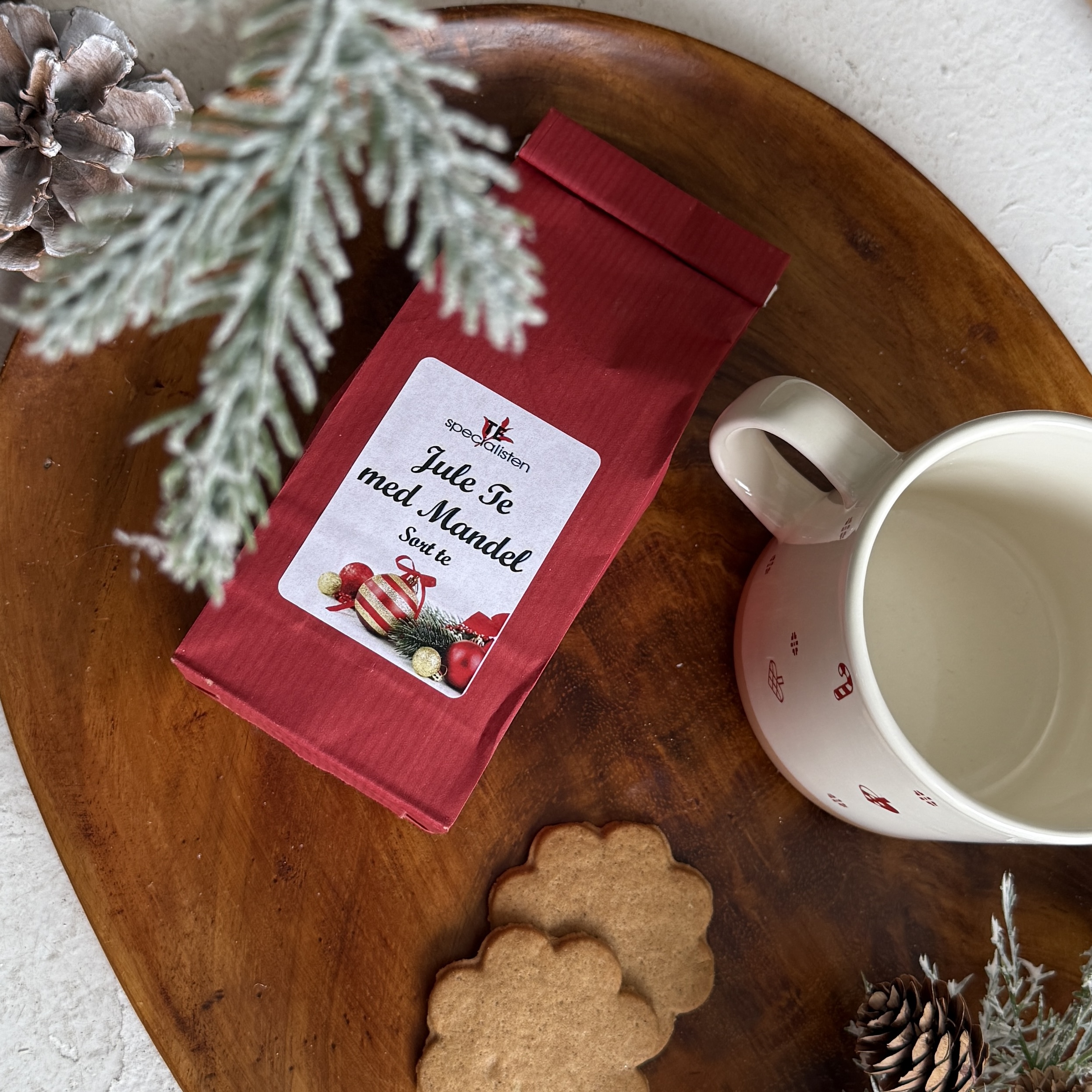 Ingredienser jule te med mandel:  Sort te, orangeskaller, nelliker, kanelstykker, hakkede mandler (3%), tørrede enebær, saflorblomst og aroma.