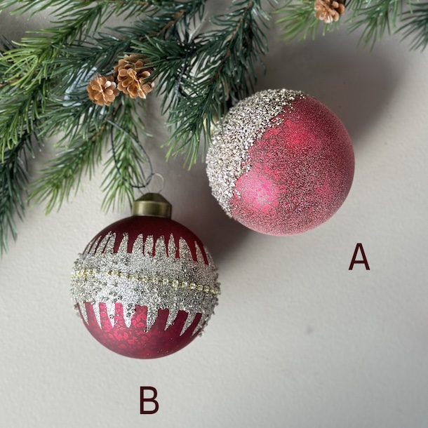 Disse fine julekugler er i rød med sølvglimmer på. De er i glas og er fine på juletræet, i vindueskarmen eller i loftet.