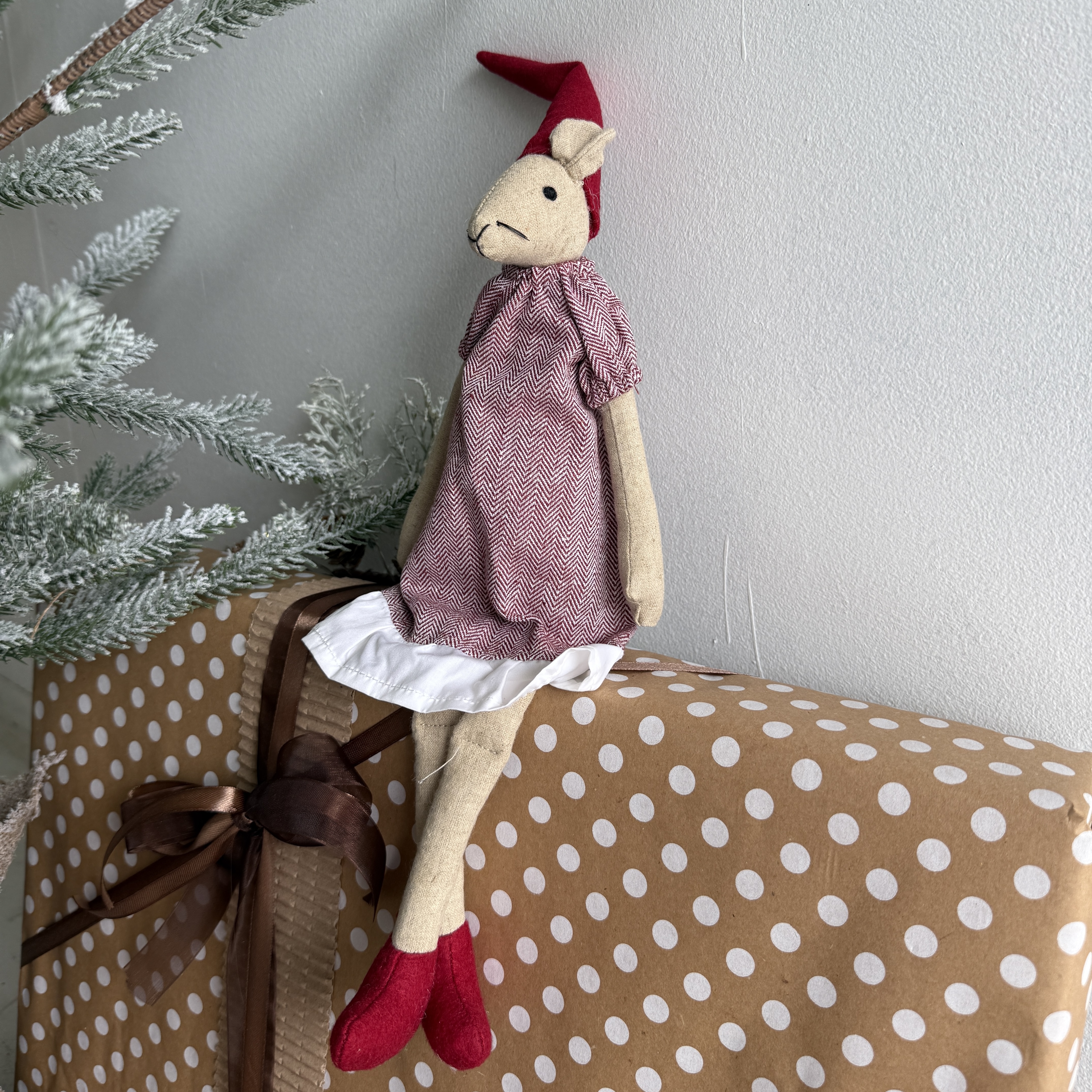 Nelli er en søde nisse pige som har en en rød og hvid sildebens kjole på som er hvid forneden og en rød nissehue.
