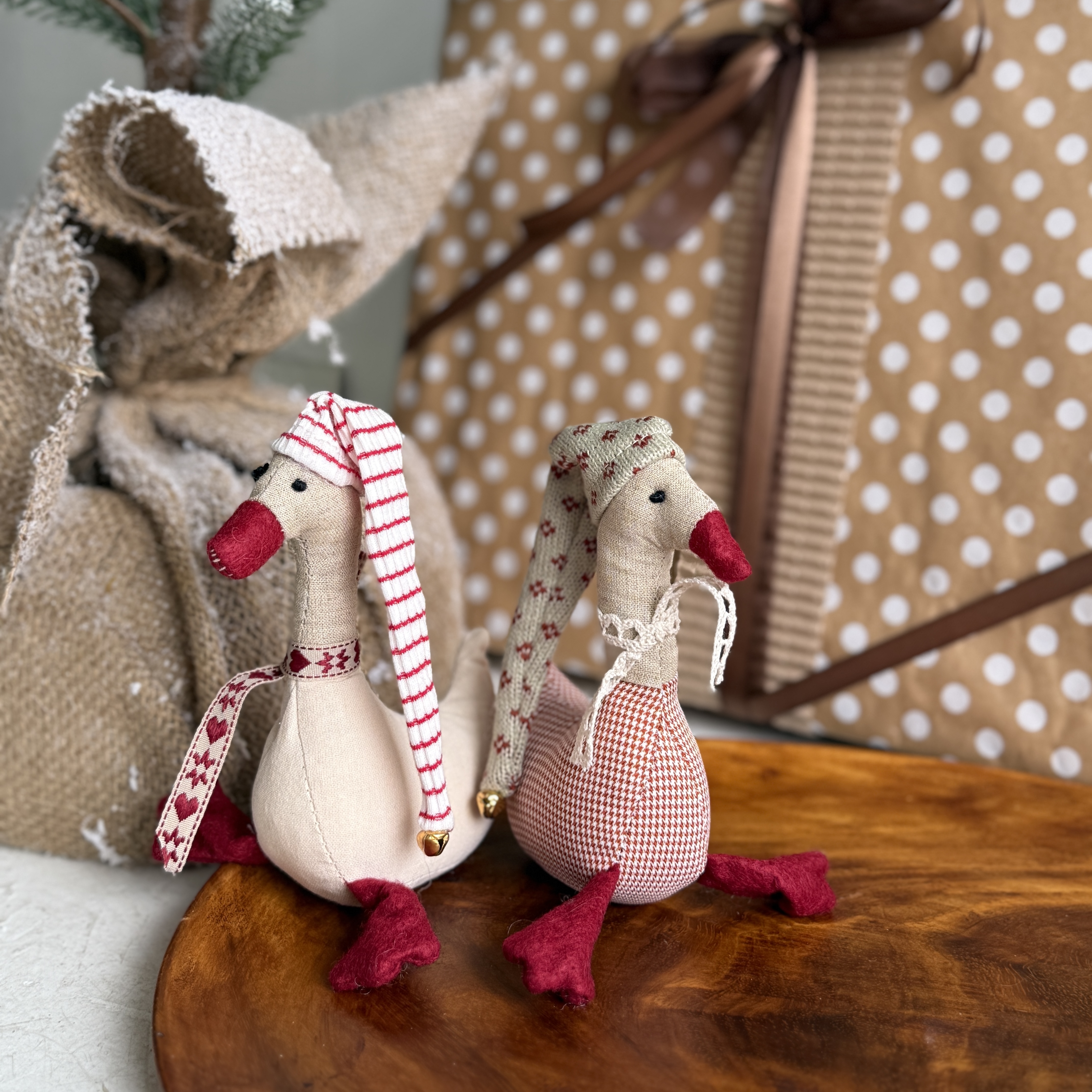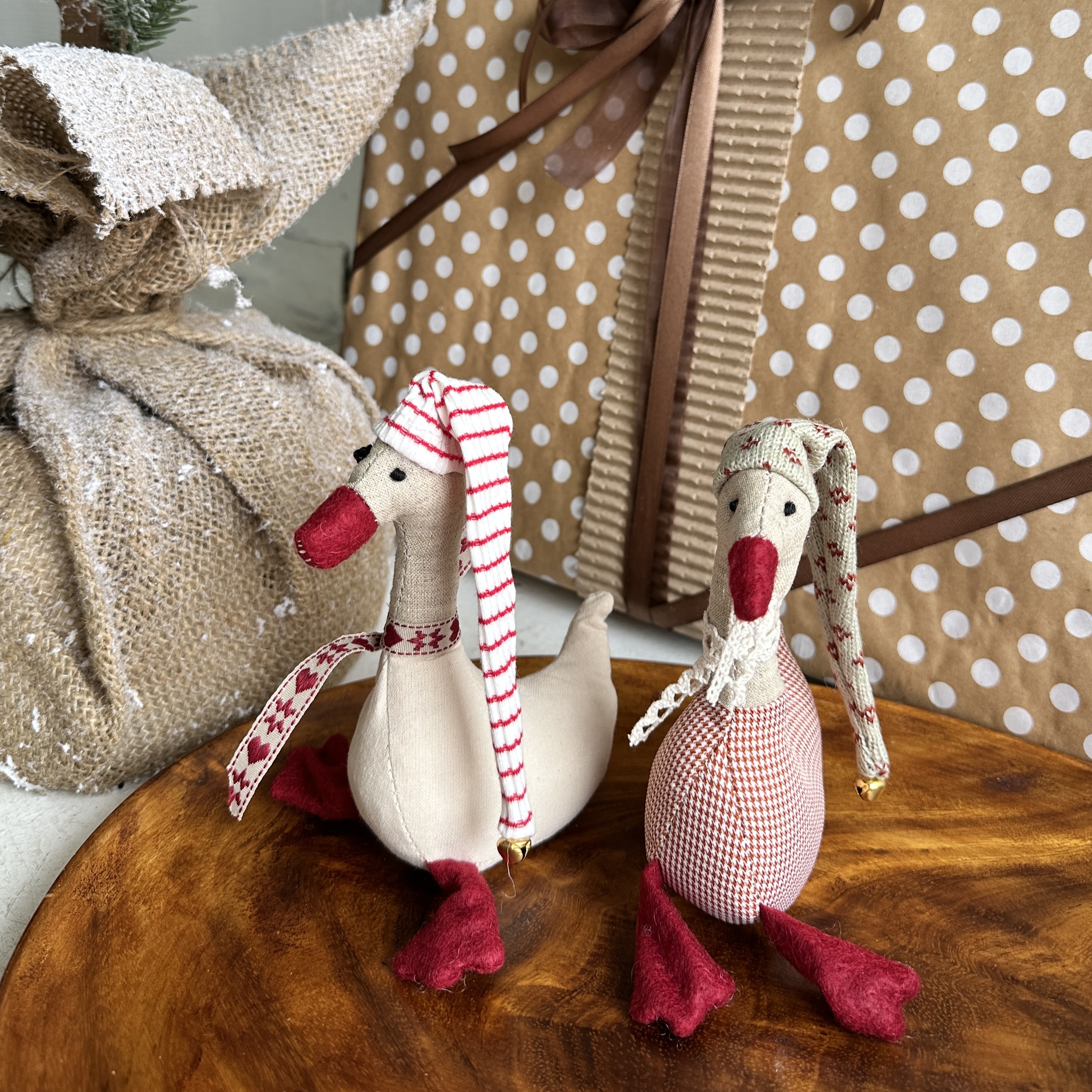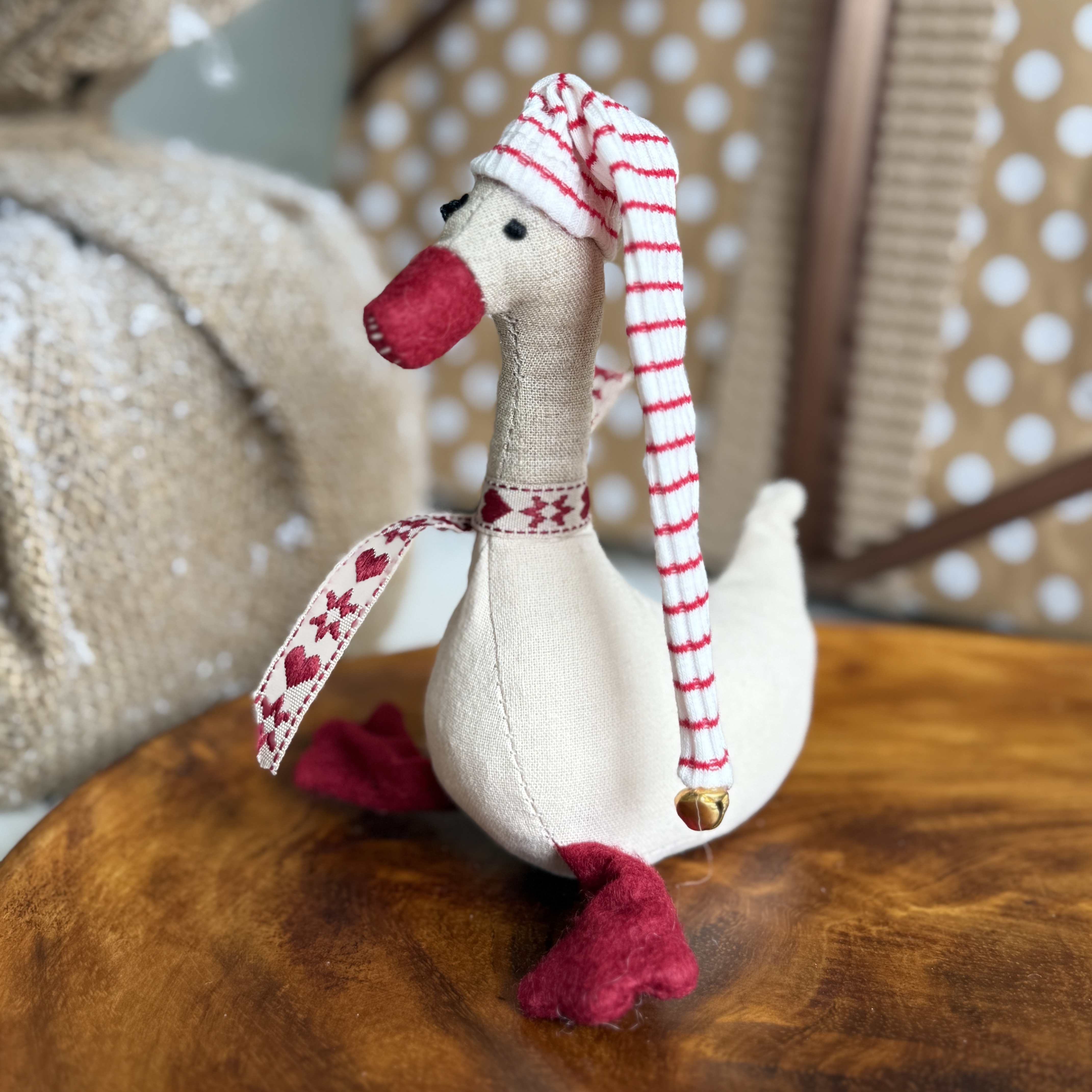 Denne søde stofgæs hedder Gytha og har både nissehue og halstørklæde med bjælde på. De fås i naturfarve og natur/rød