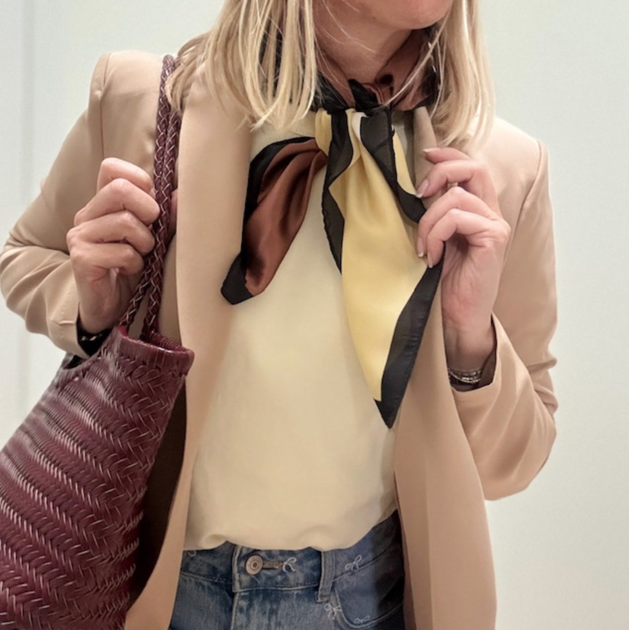 Denne flotte kvadratiske tørklæde fås i rosa, blå, gul og lilla med brunlige nuancer.