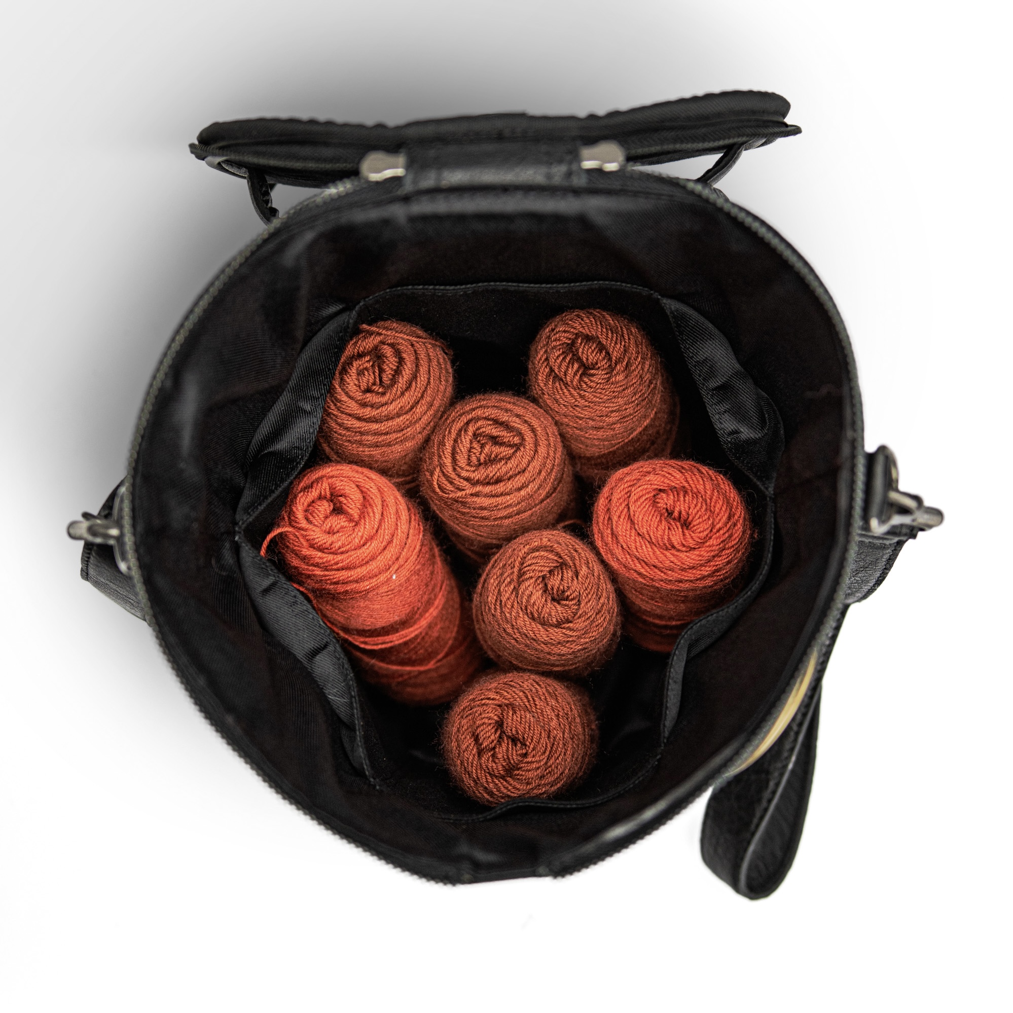 Strikketasken er både flot at have stående fremme i stuen, men har også en lang rem så man kan have den med i strikkeklubben.