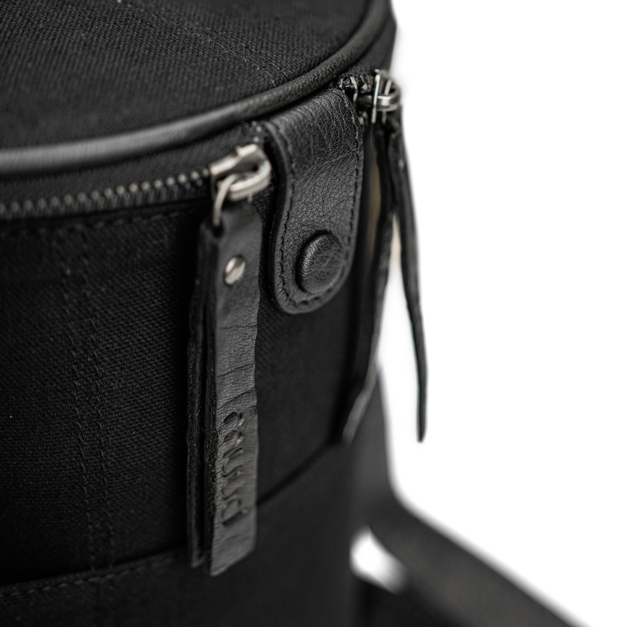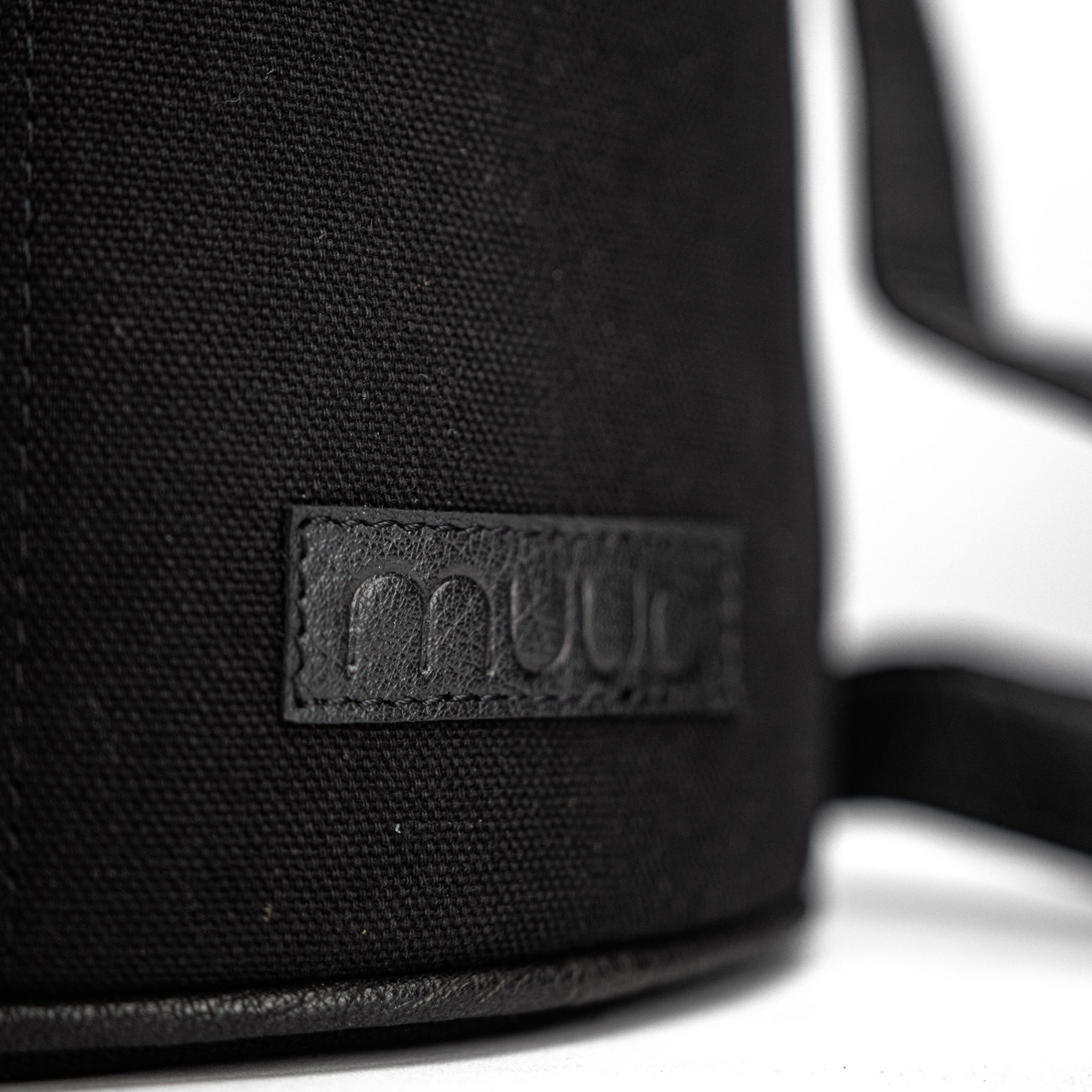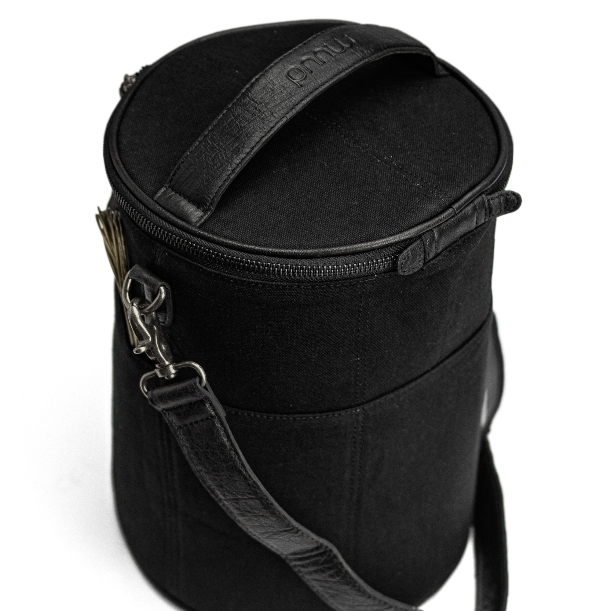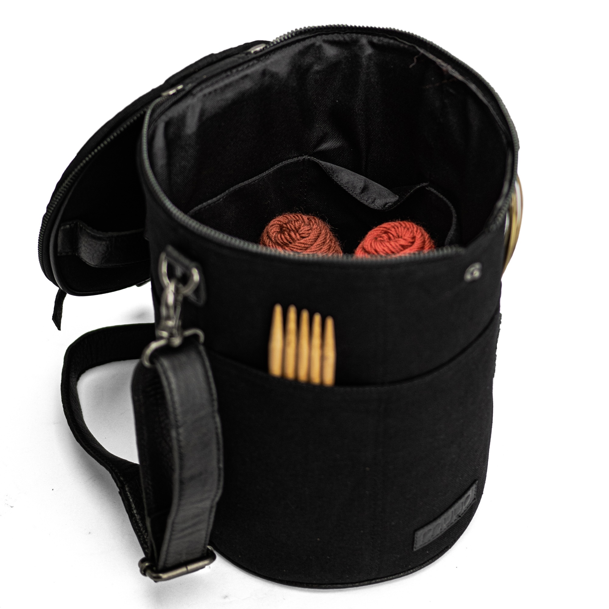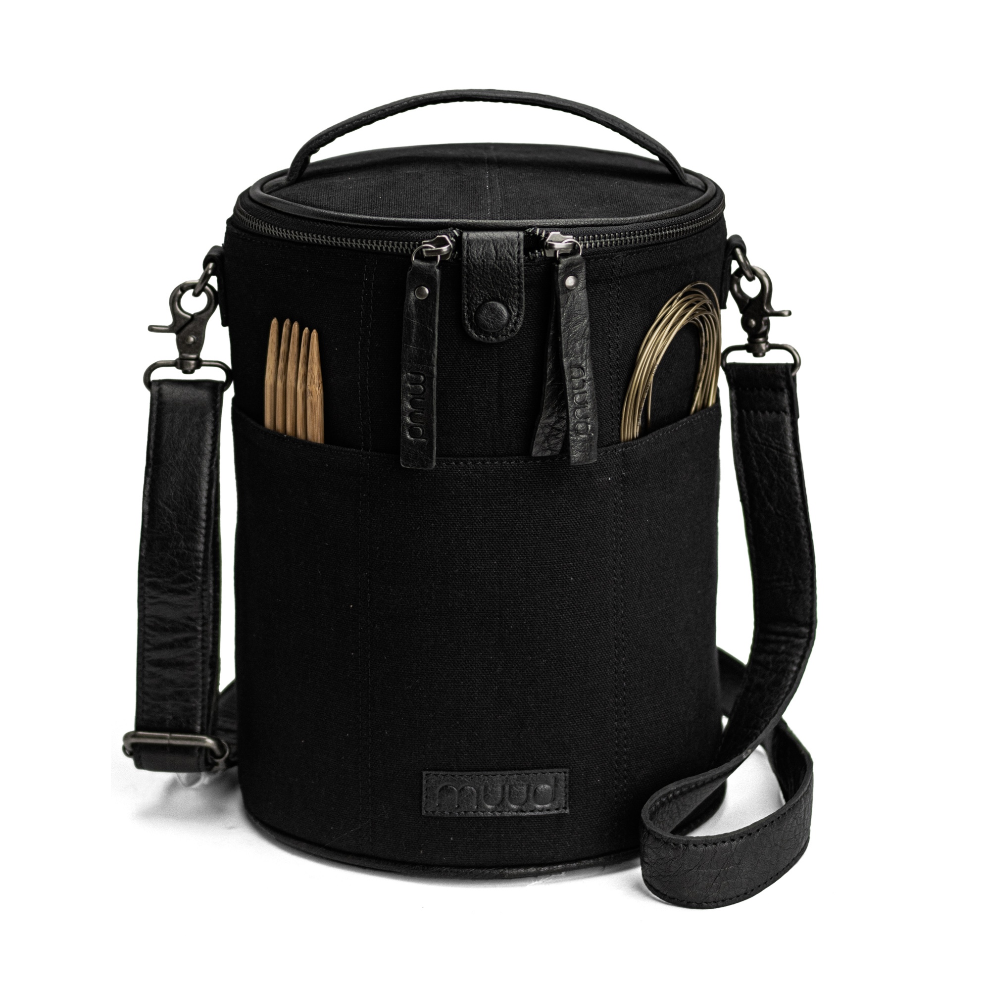 Stor strikketaske i sort canvas fra Muud med mange rum til at fordele strikkepinde.