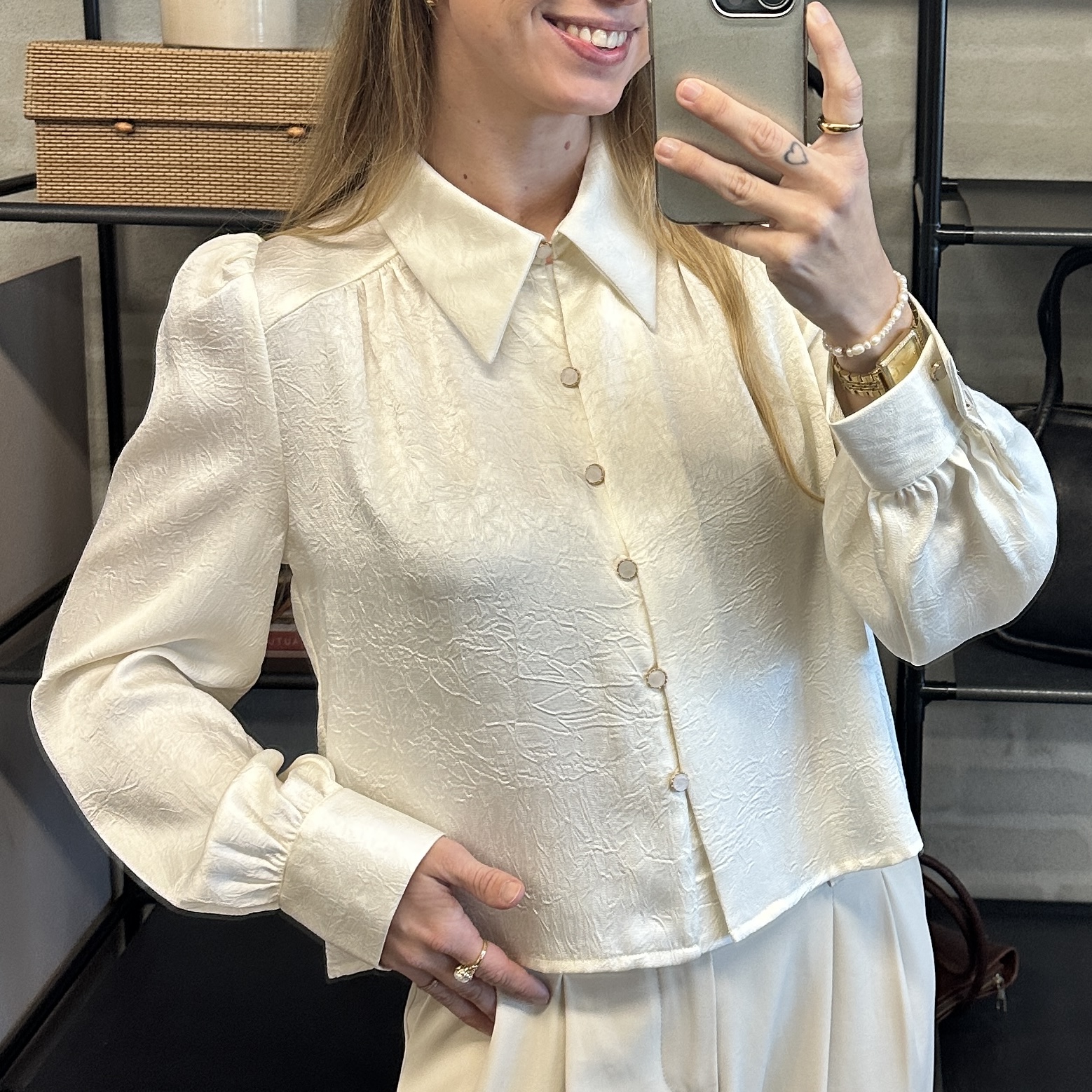 Denne skjorte er kortere og er derfor smuk med nederdele og højtaljede bukser.