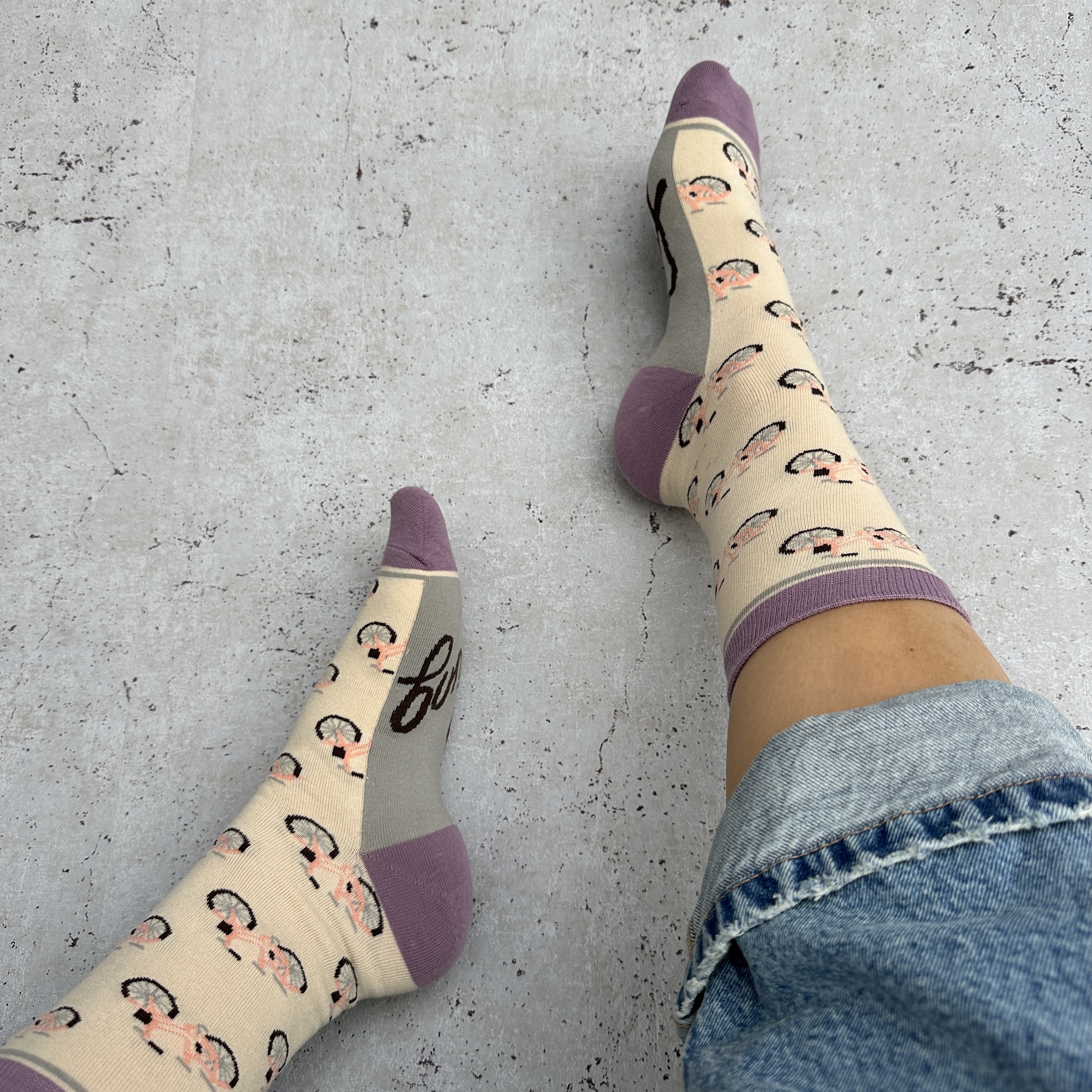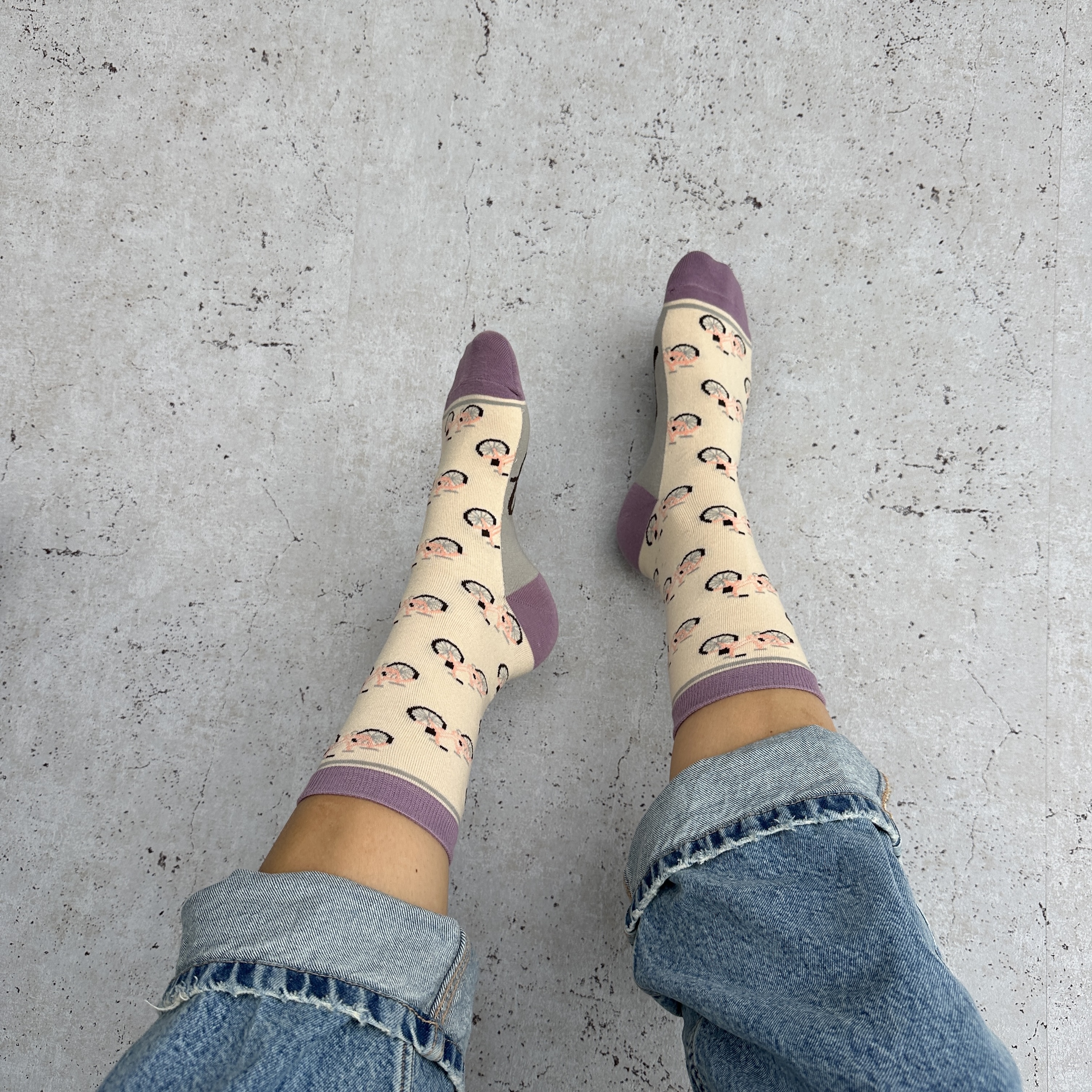 Rigtig flotte strømper med cykelmotiv i 4 flotte farver.