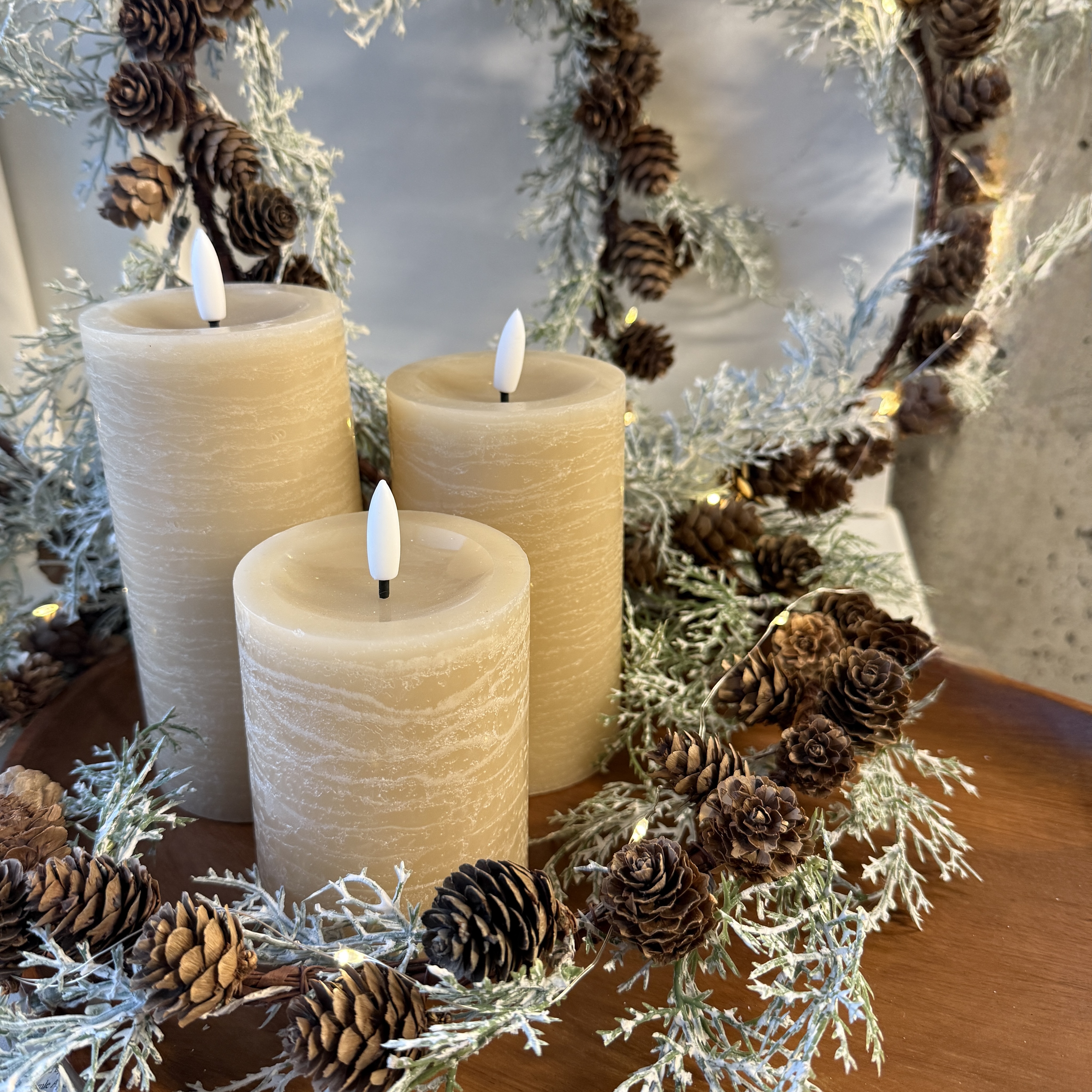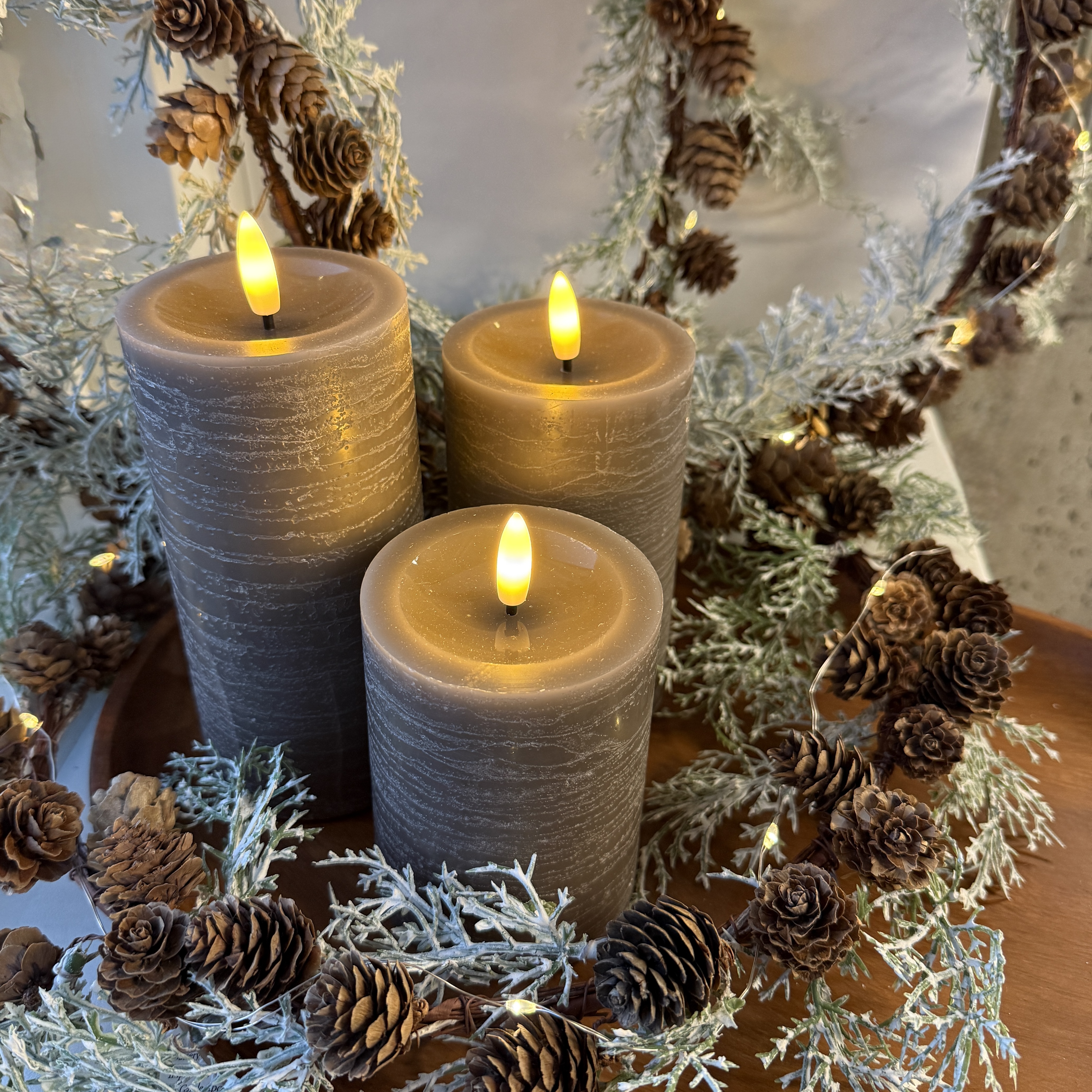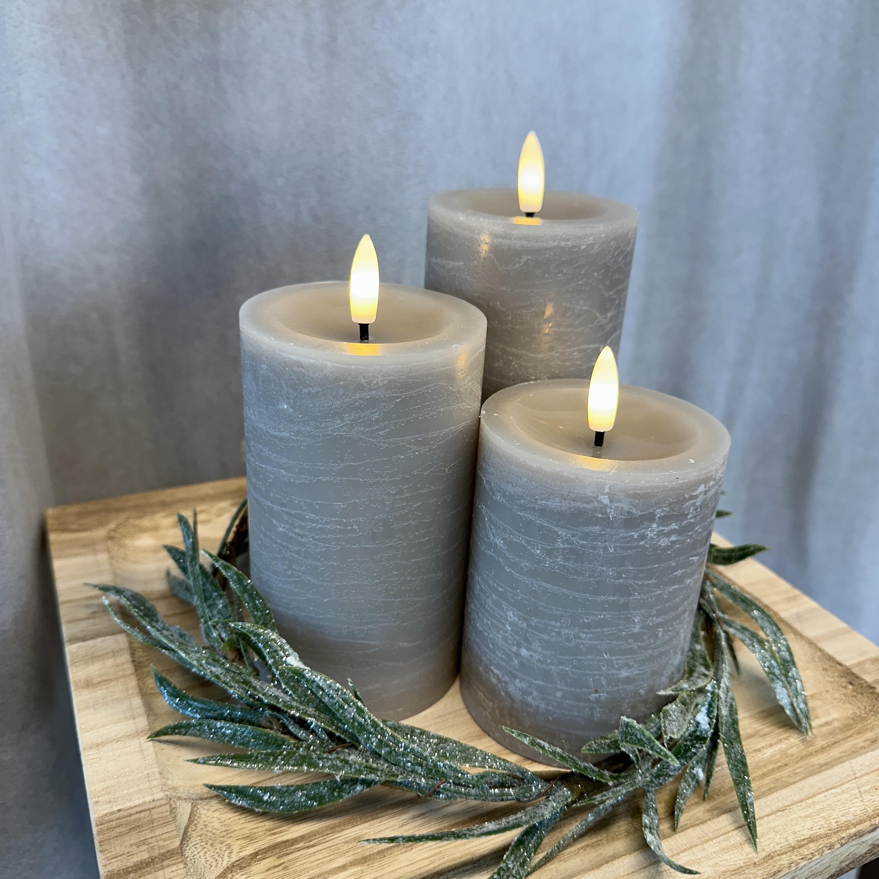 Rigtig fine led lys med stemningsfyldt naturtro flamme. Sættet har 3 LED lys, hvor der medfølger fjernbetjening. Disse flotte ledlys er rustikke i overfalden. Fjernbetjening har tænd/sluk funktion samt timer.