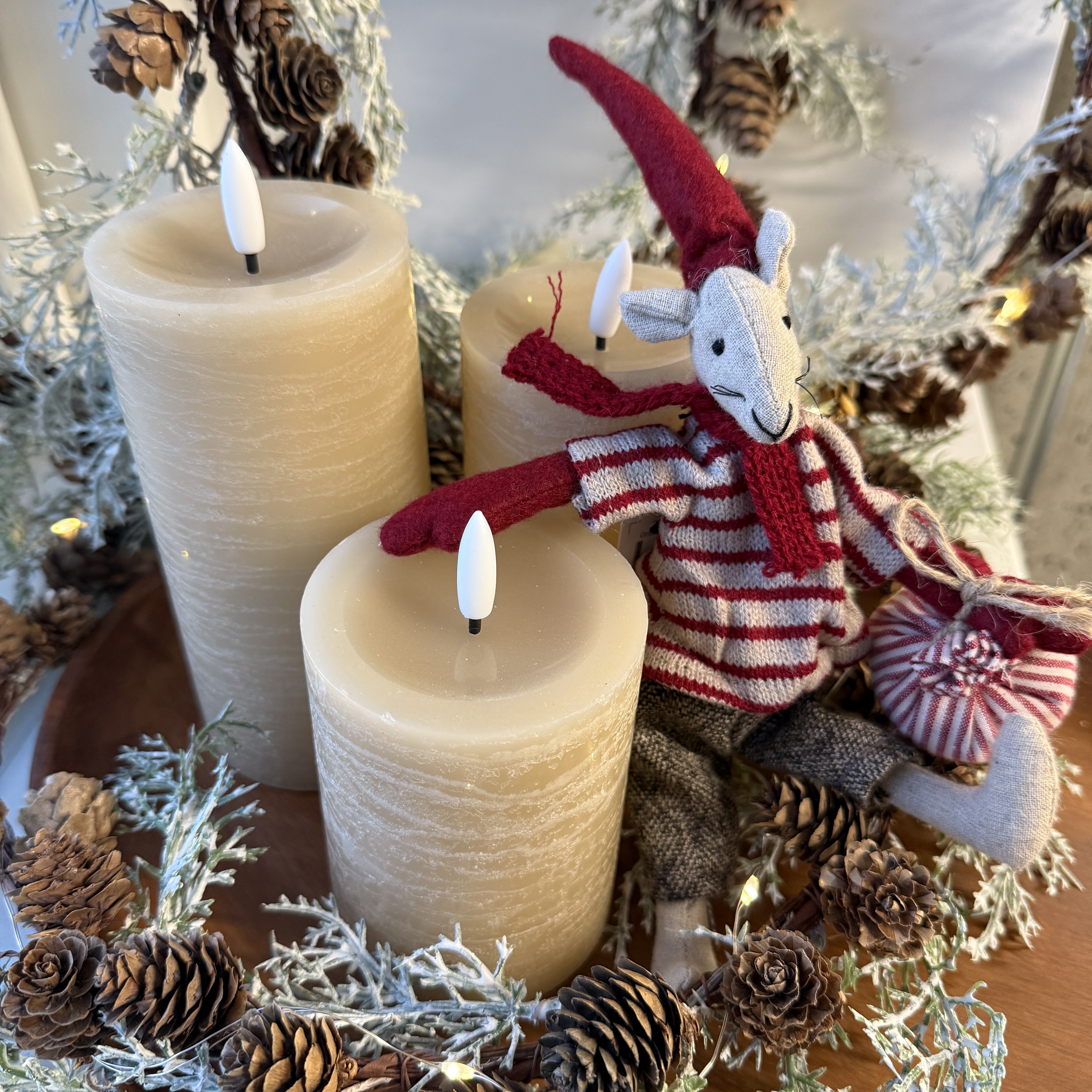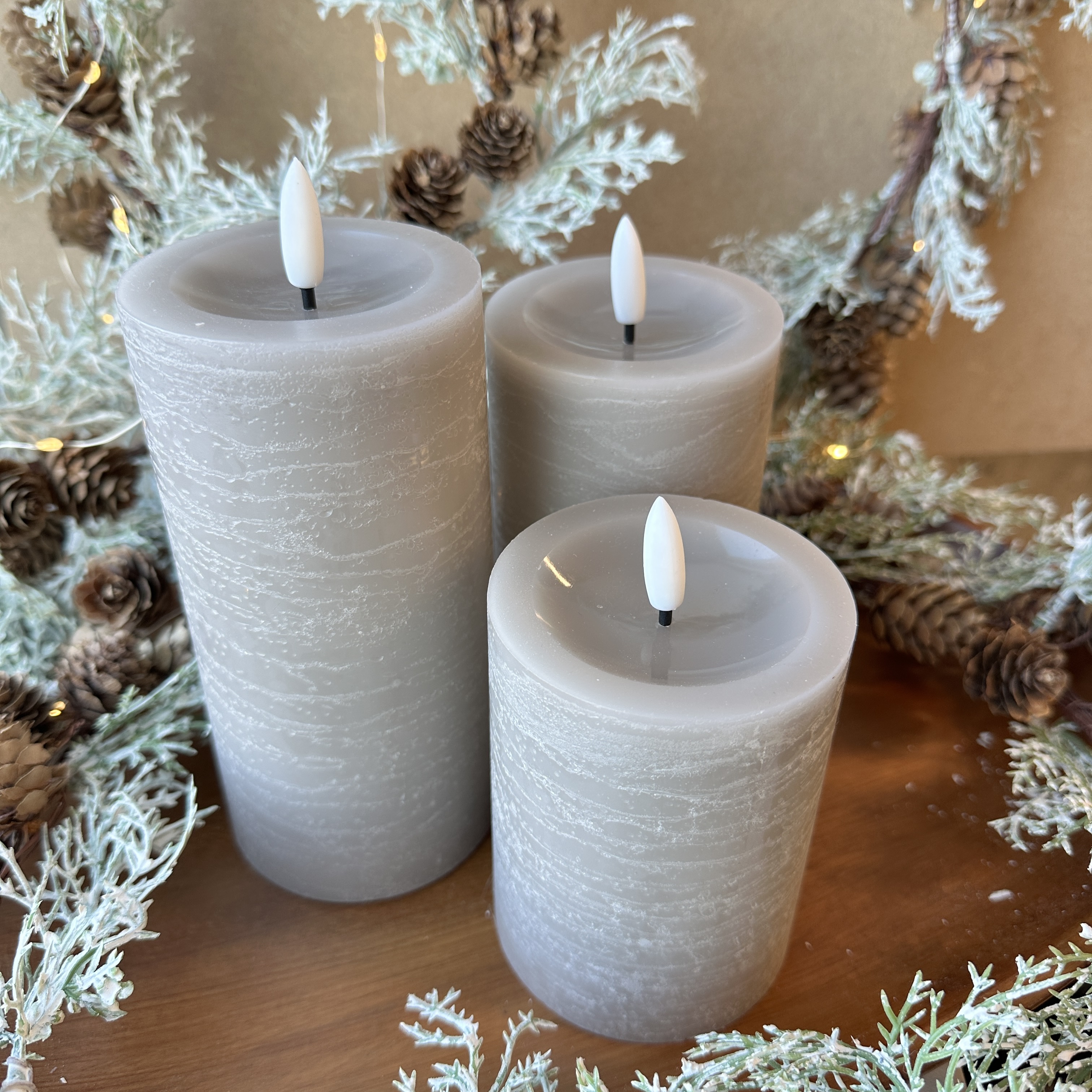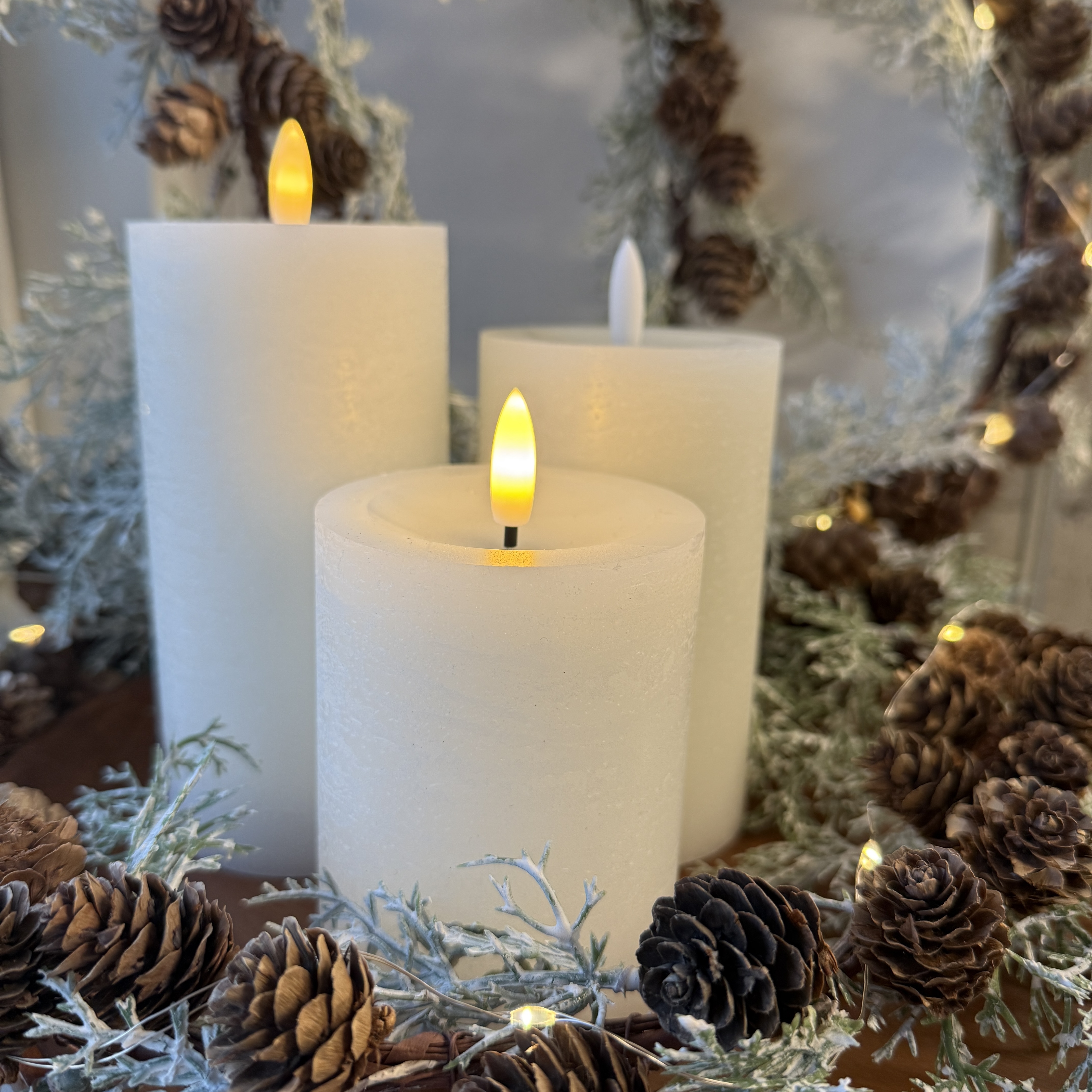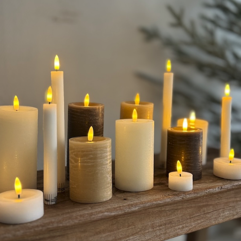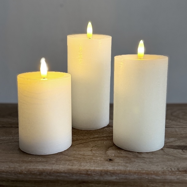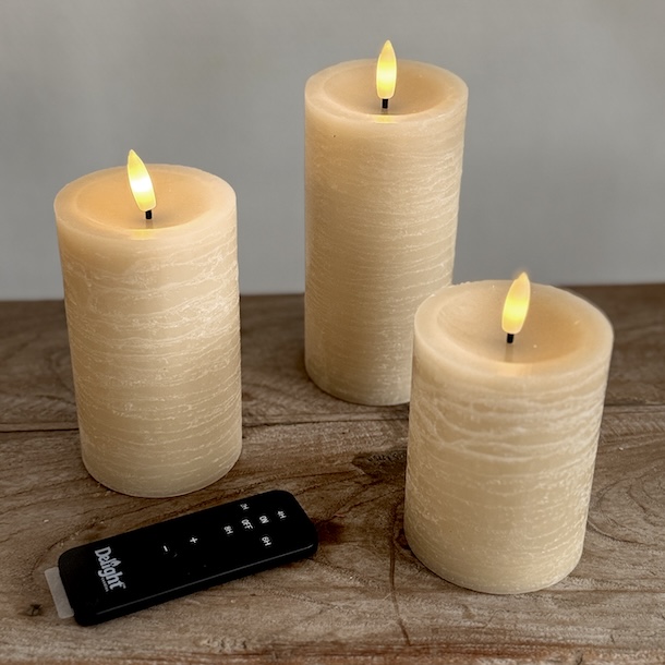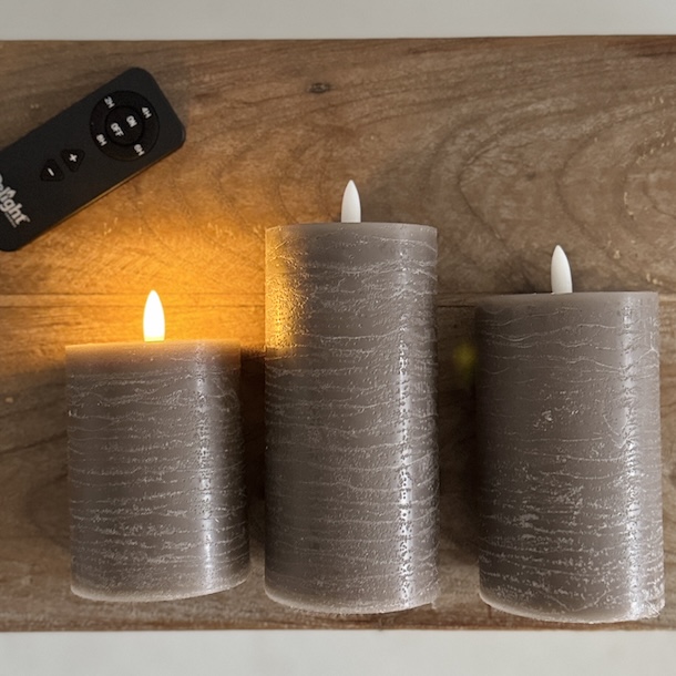 Denne fine gaveboks består af 3 LED bloklys og en fjernbetjening. Lysene er i 3 størrelser. Lysene fås i beige, mocca brun og knækket hvid.