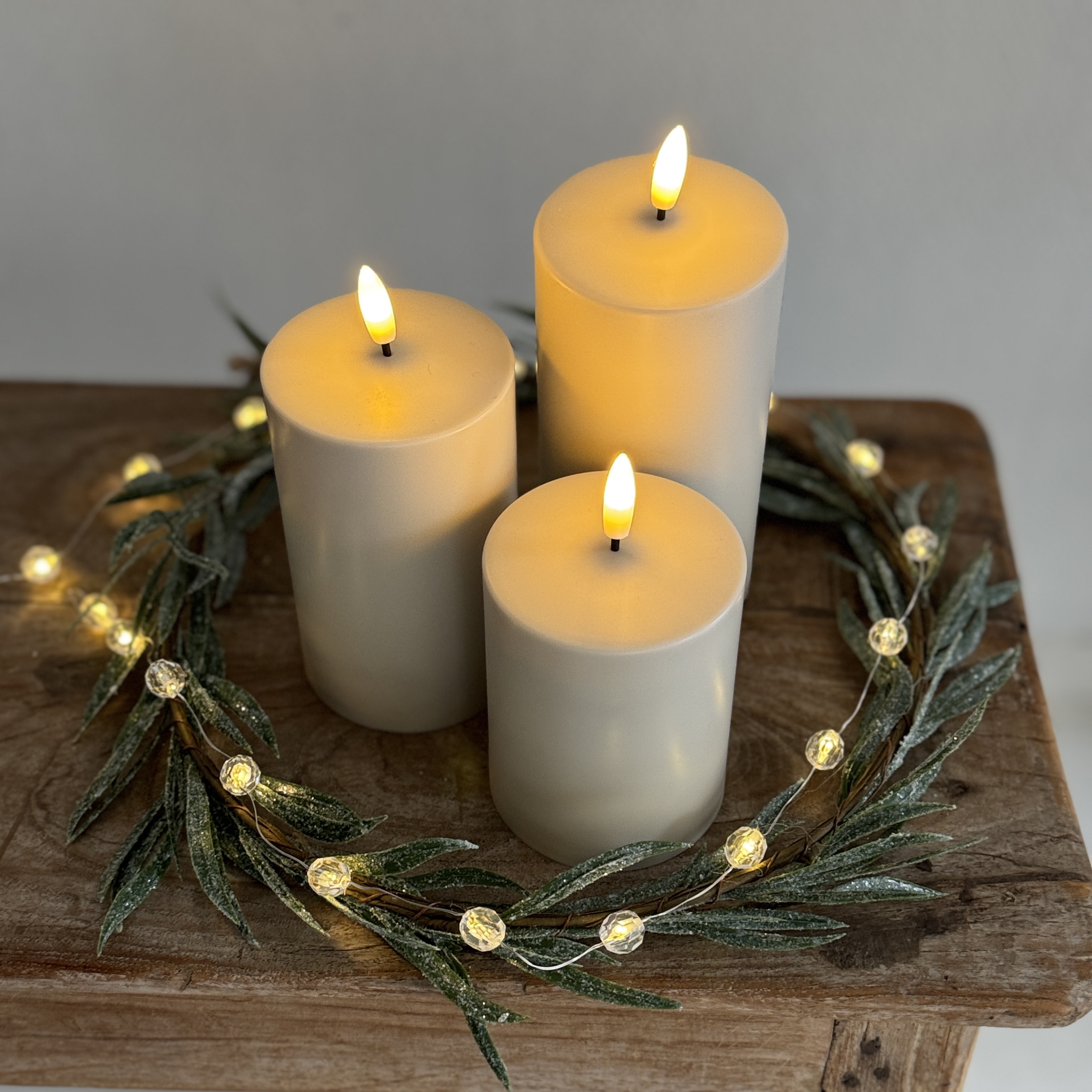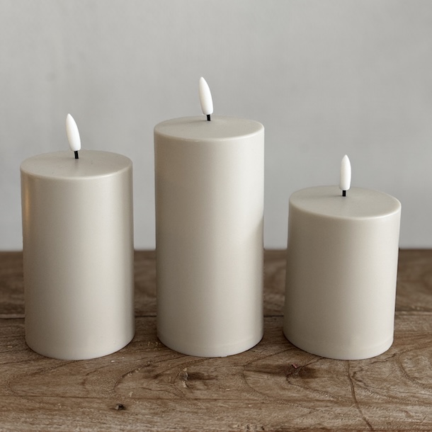 Denne fine gaveboks består af 3 udendørs LED bloklys og en fjernbetjening. Lysene er i 3 størrelser. Lysene fås i lys caramel, sand og hvid.