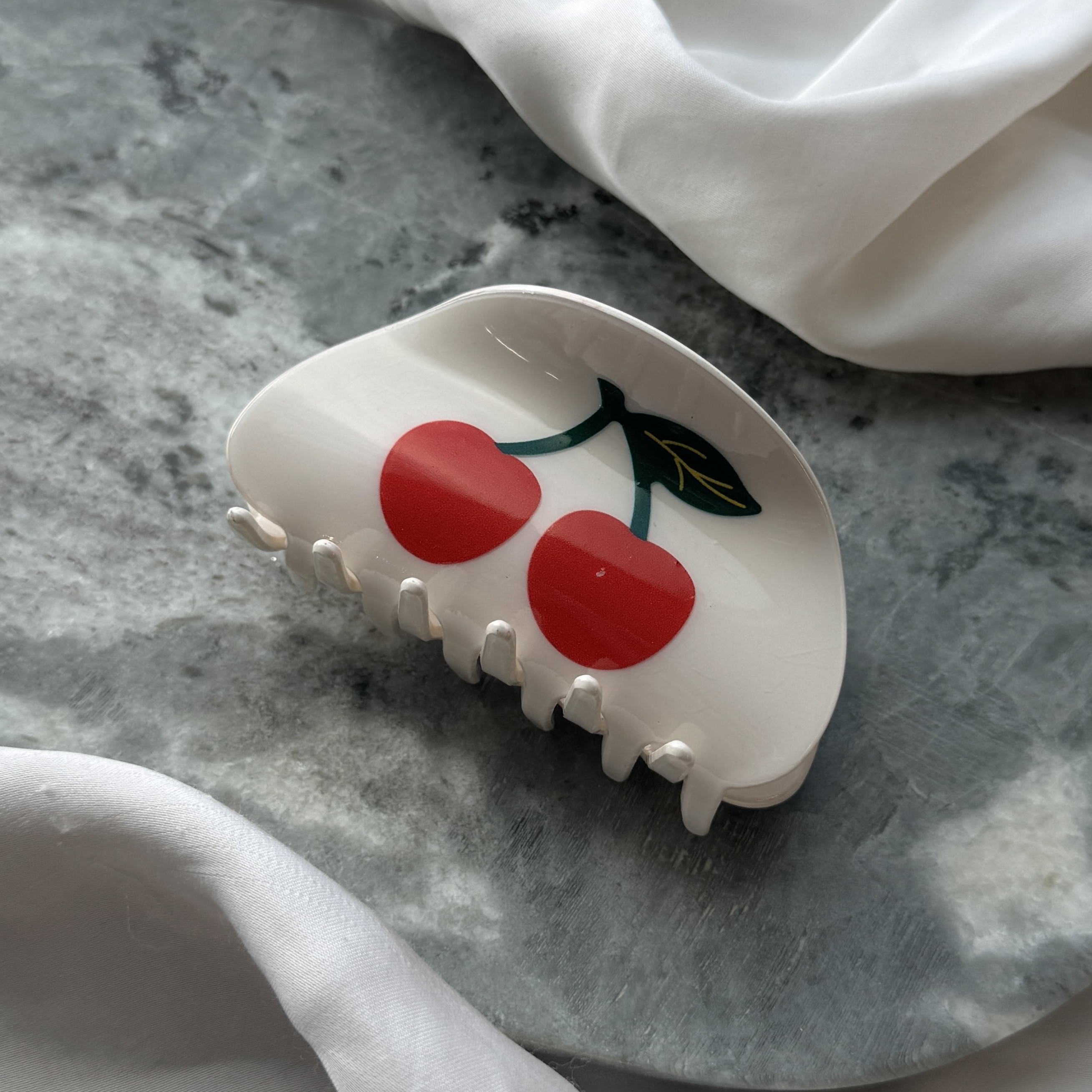 En super fin mellem hårklemme med kirsebær print som fås i fire farver.