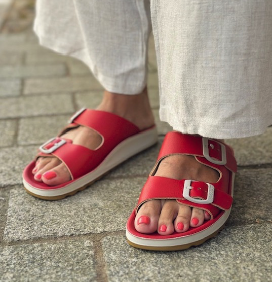 En lækker anatomic slip in sandal i klassisk rød skind. Den har stødabsorberende sål der samtidig er letvægts materiale. det gør den yderst komfortabel og skånsom at gå i.