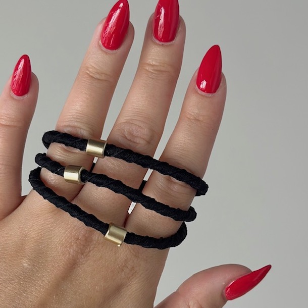 Disse fine og gode elastikker ligger i sæt af tre. De er med fine snoninger. De fås i en pakke af str sorte eller en pakke af 1 beige, 1 brun og 1 sort.