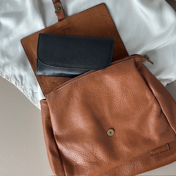 Selve pungen lukkes med en klap med magnet trykknap. Indvendig er der to rum, hvor der i det bagerste er kortrum til tre kort. Bagpå har pungen en lynlåslomme til fx dine mønter. Der medfølger en løs kortholder, som har to rum til kort og en lynlåsrum til mønter. Kortholderen kan være i pungen eller bruges hver for sig.