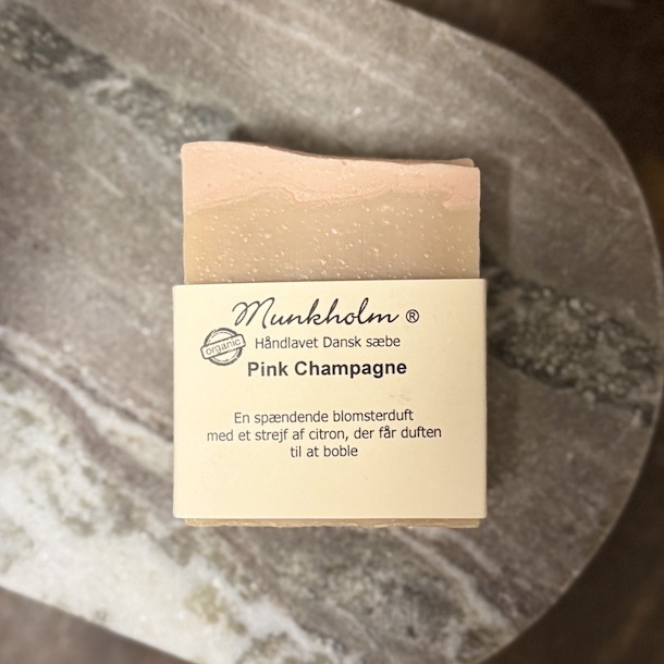 Pink champagne sæben er en håndlavet sæbe med labels fra Munkholm. Pink champagne sæben er med en fantastisk blomsterduft med lidt citron duft.