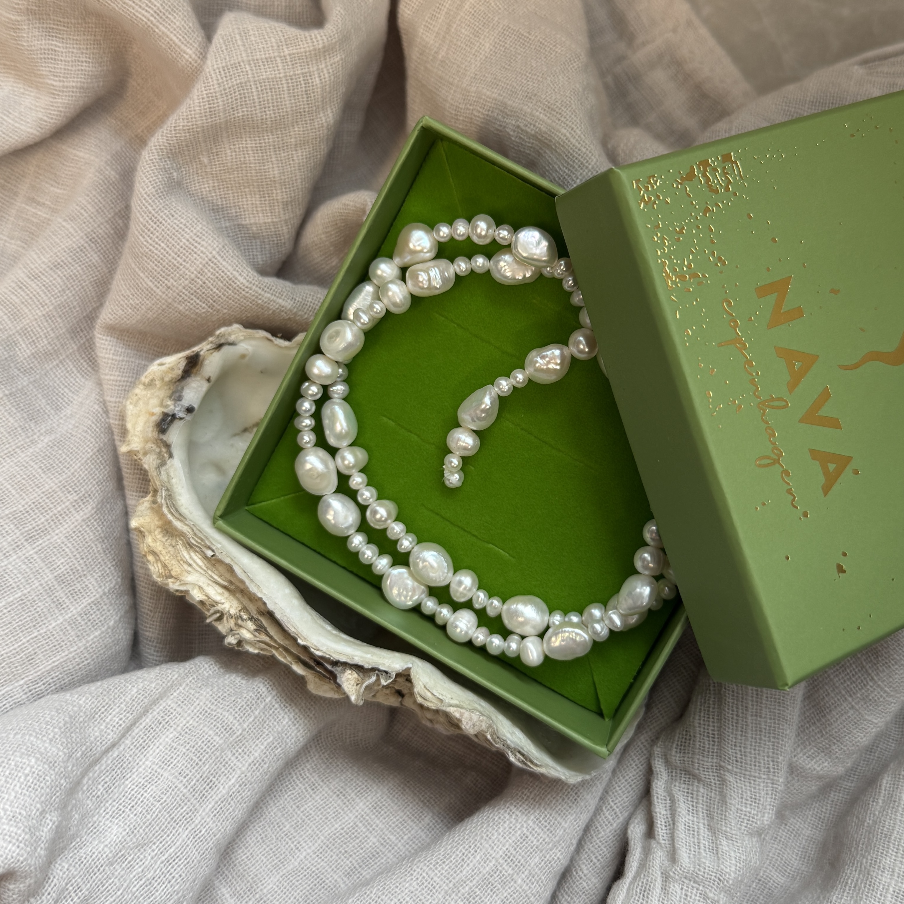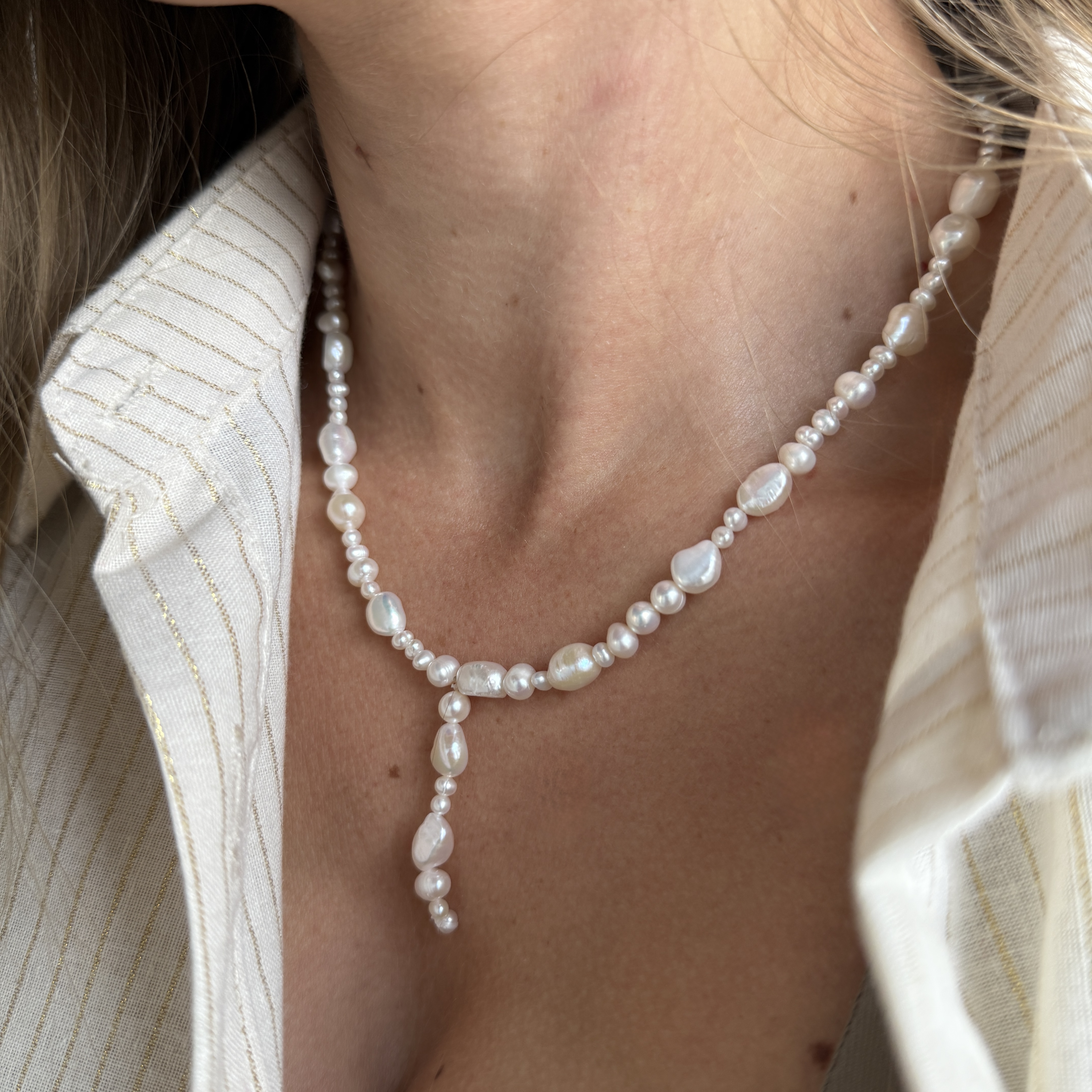 Etta Necklace er designet med en smuk kombination af runde og uregelmæssige ferskvandsperler, der skaber et naturligt, sofistikeret look. Det elegante drop foran tilføjer et unikt touch.