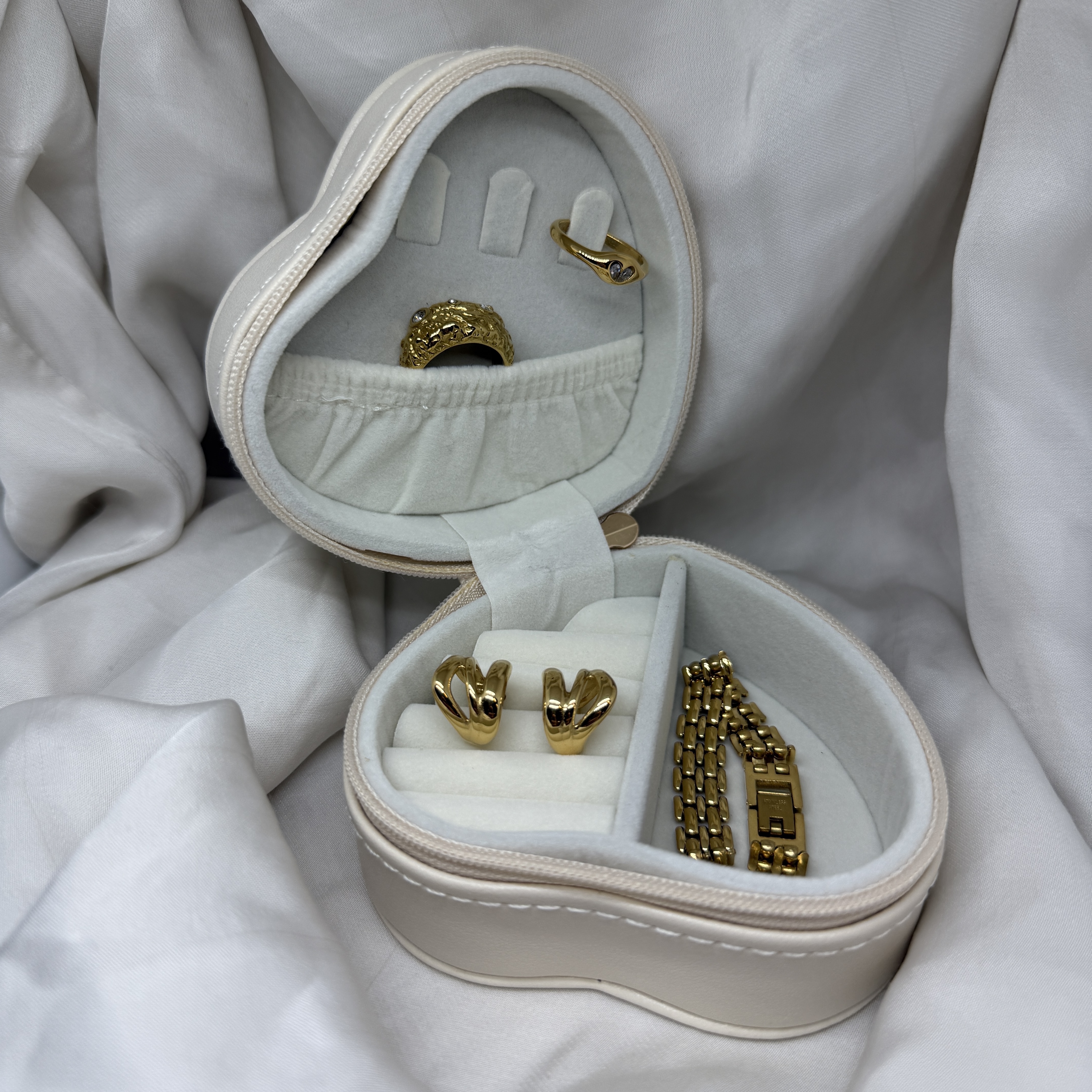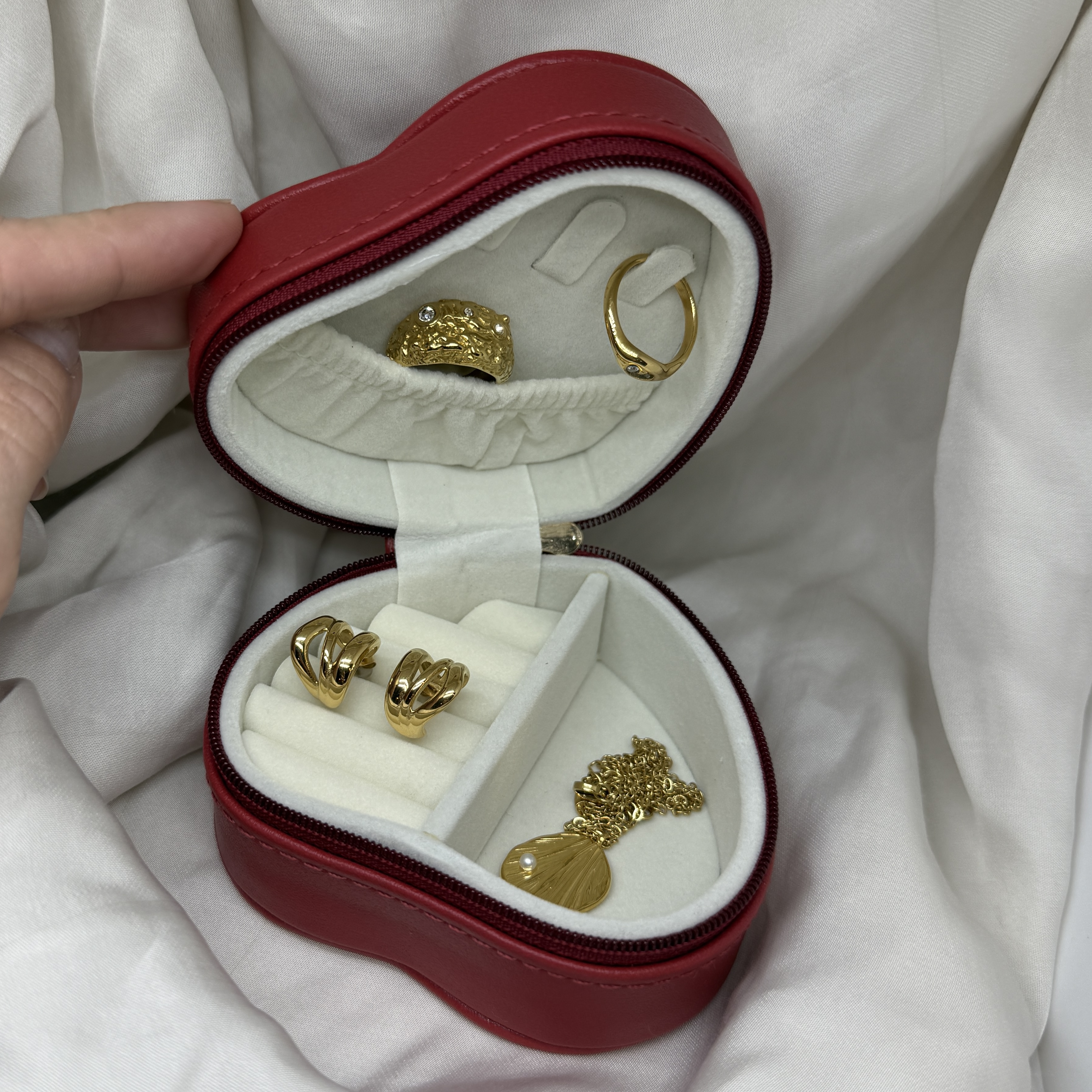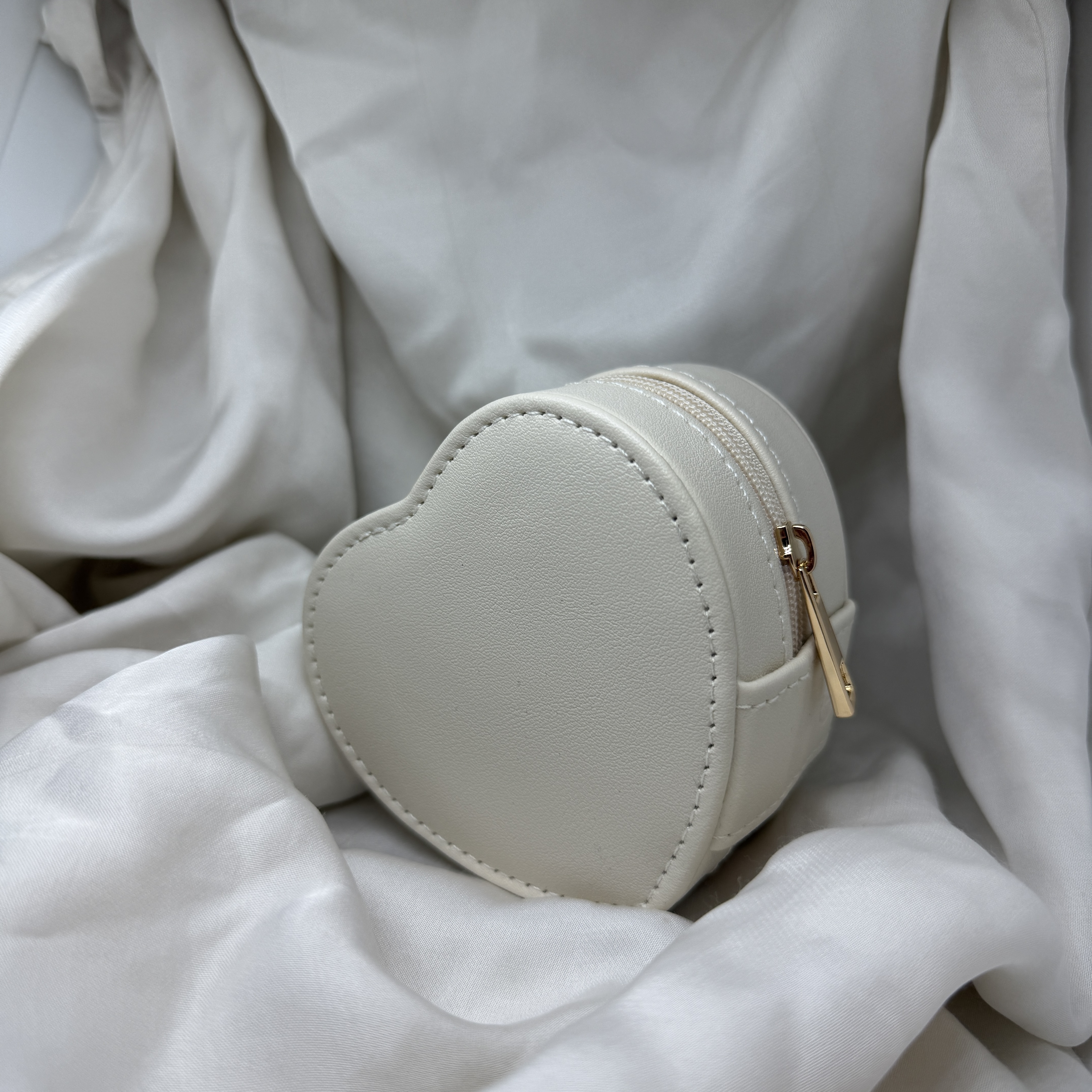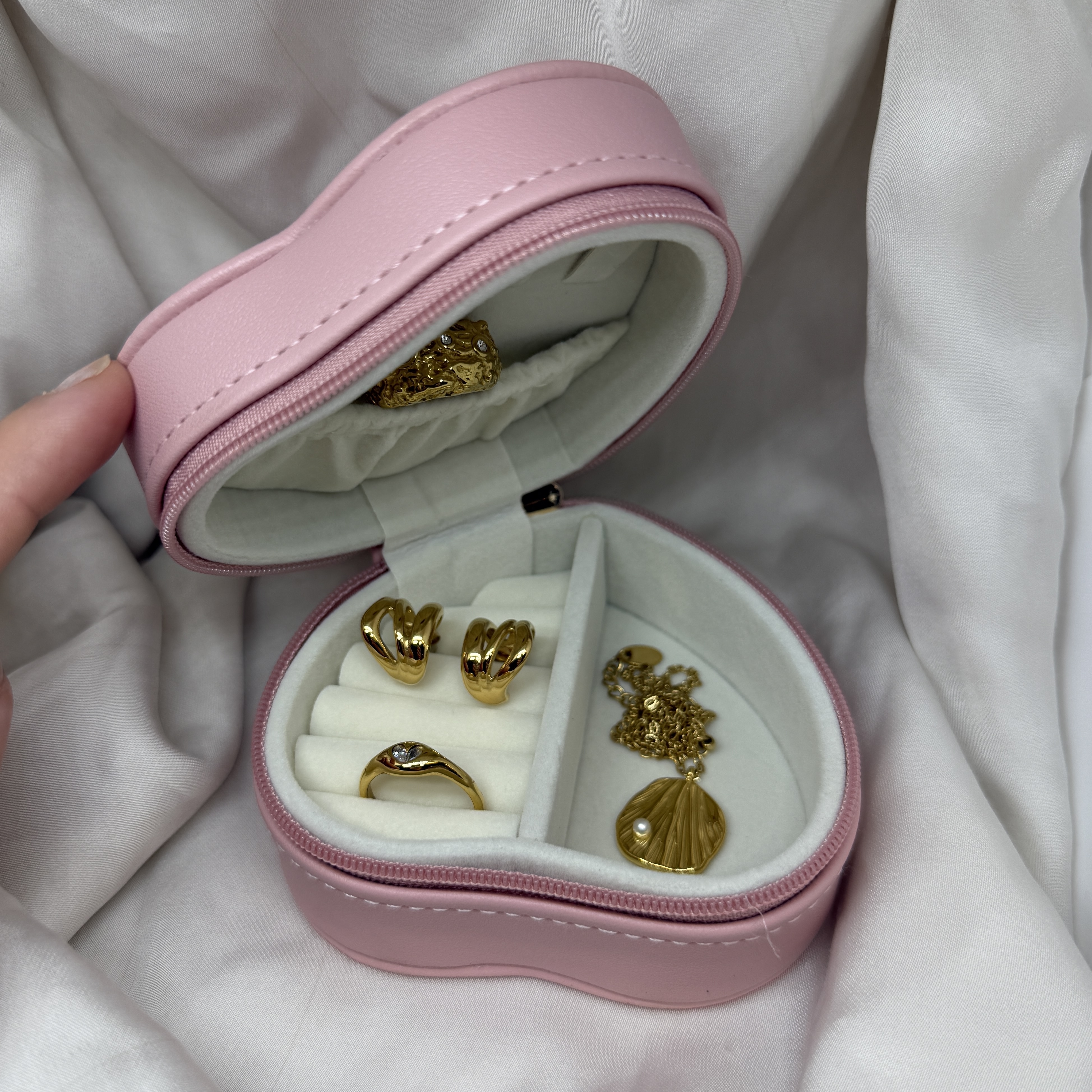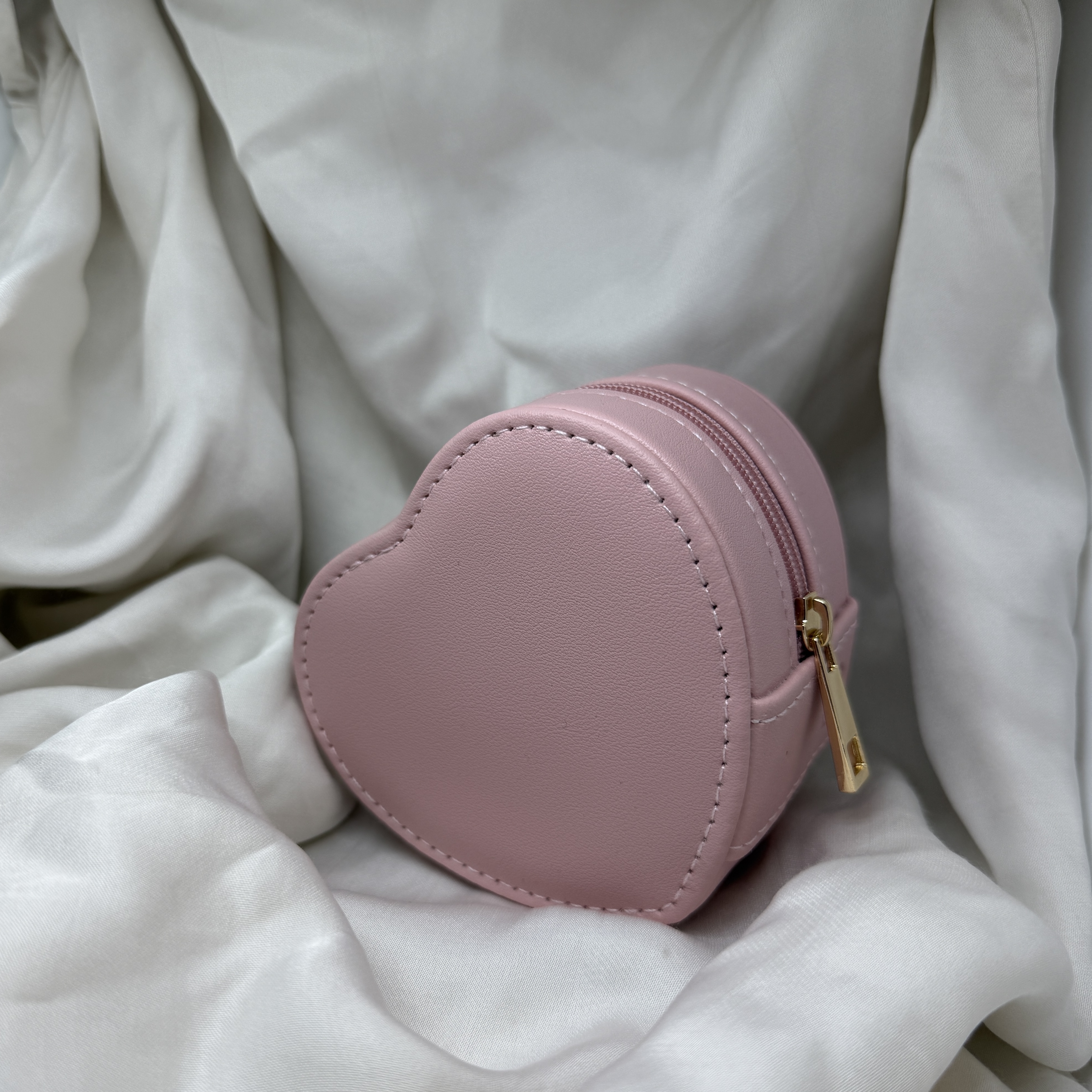 Denne skønne lille hjerte smykkeskrin er perfekt til at holde orden i dine smykker. Smykkeskrinet åbnes med en lynlås.