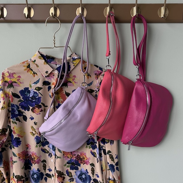 Bæltetasken fås i farverne: Mettalic kobber, lavendel, pudder, mosgrøn, lys blå, sort, ceriserød og fuchsia.
