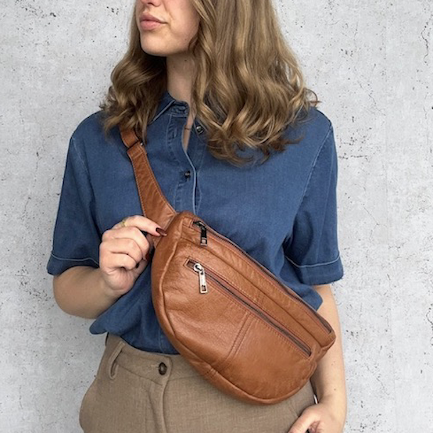 Bumbagen har en lang justerbar rem og fås i sort og cognac.