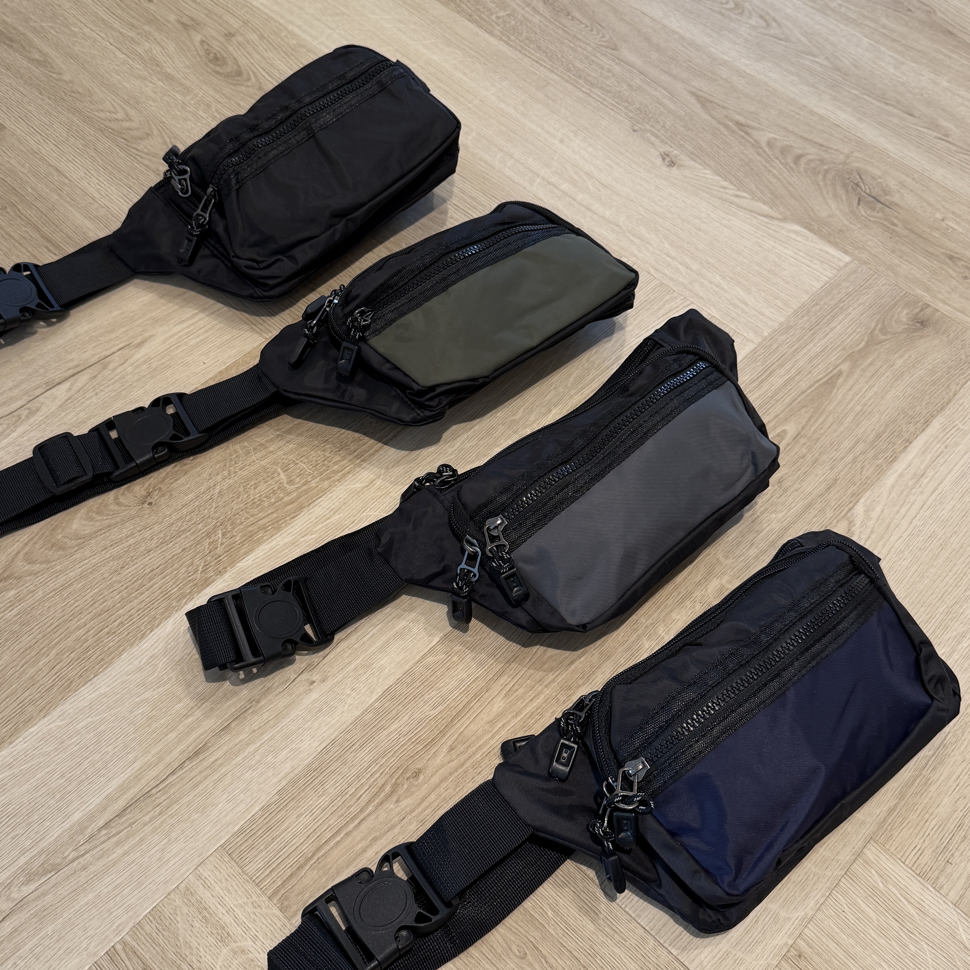 Bæltetasken har en lang justerbar rem, som lukkes med en klik system og fås i sort, grå, marine og grøn.