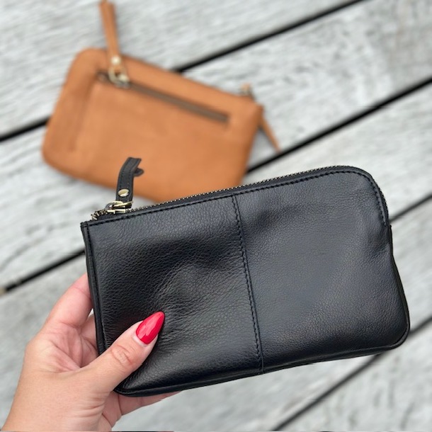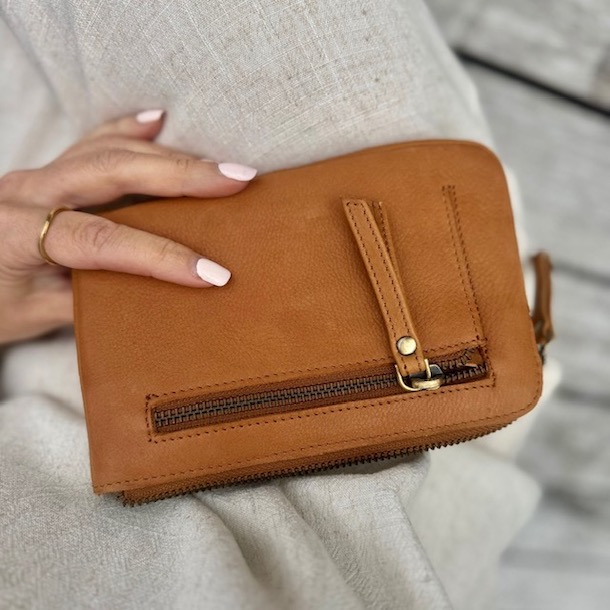 Lækker stor pung med plads til mobil i blødt cognac farvet læder