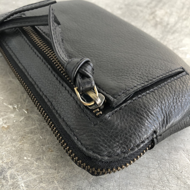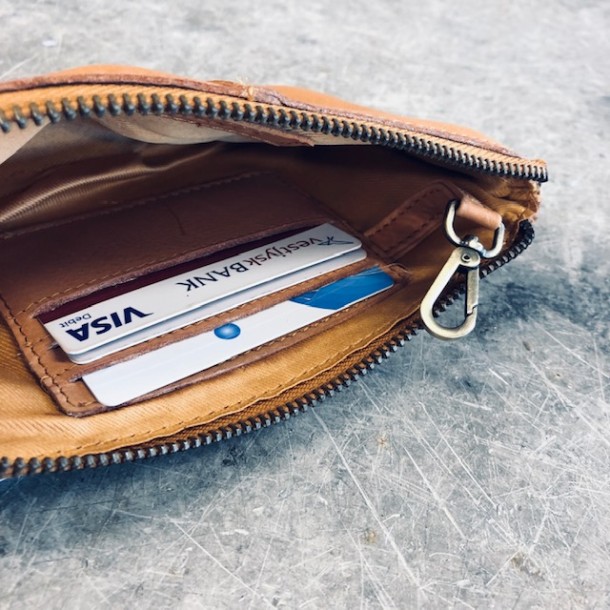 Tasken har vi hovedrum, der lukkes med en lynlås. Inde i det er der en nøglesnor med karabinhage, plads til tre kreditkort og kan fint rumme en stor mobiltelefon med cover.