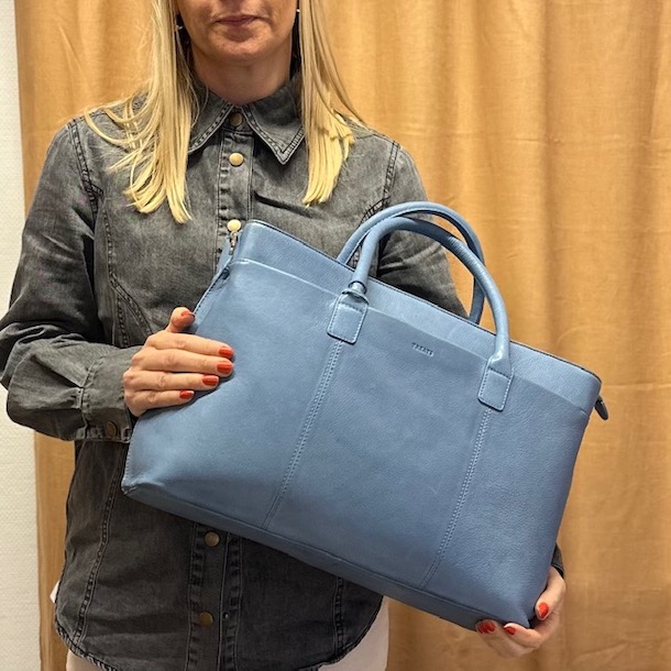 Tasken har to hanke og en lang aftagelig justebar rem og fås i sort, blå og cognac.