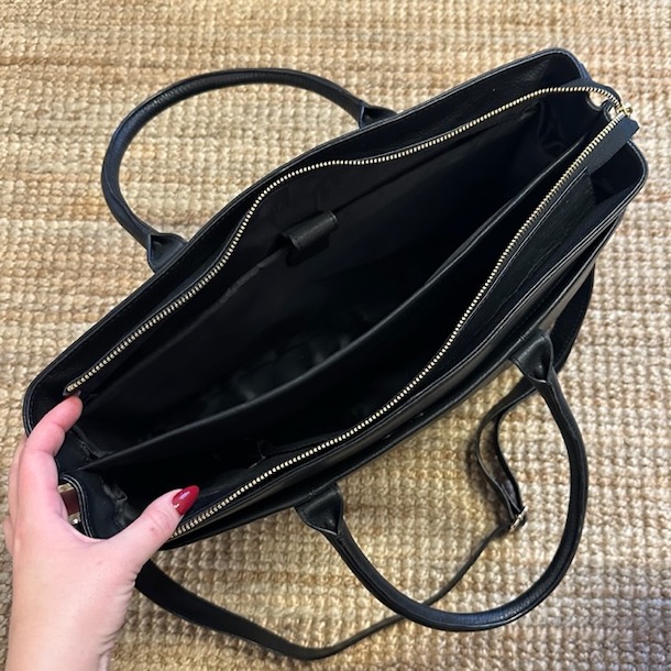 Tasken har et stort hovedrum, hvori der først er en foret rum til din laptop, en smal rum og et større rum, hvori der er en lynlåslomme og to stiklommer. Udvendig har tasken på begge sider en stor lomme som lukkes med en trykknap.