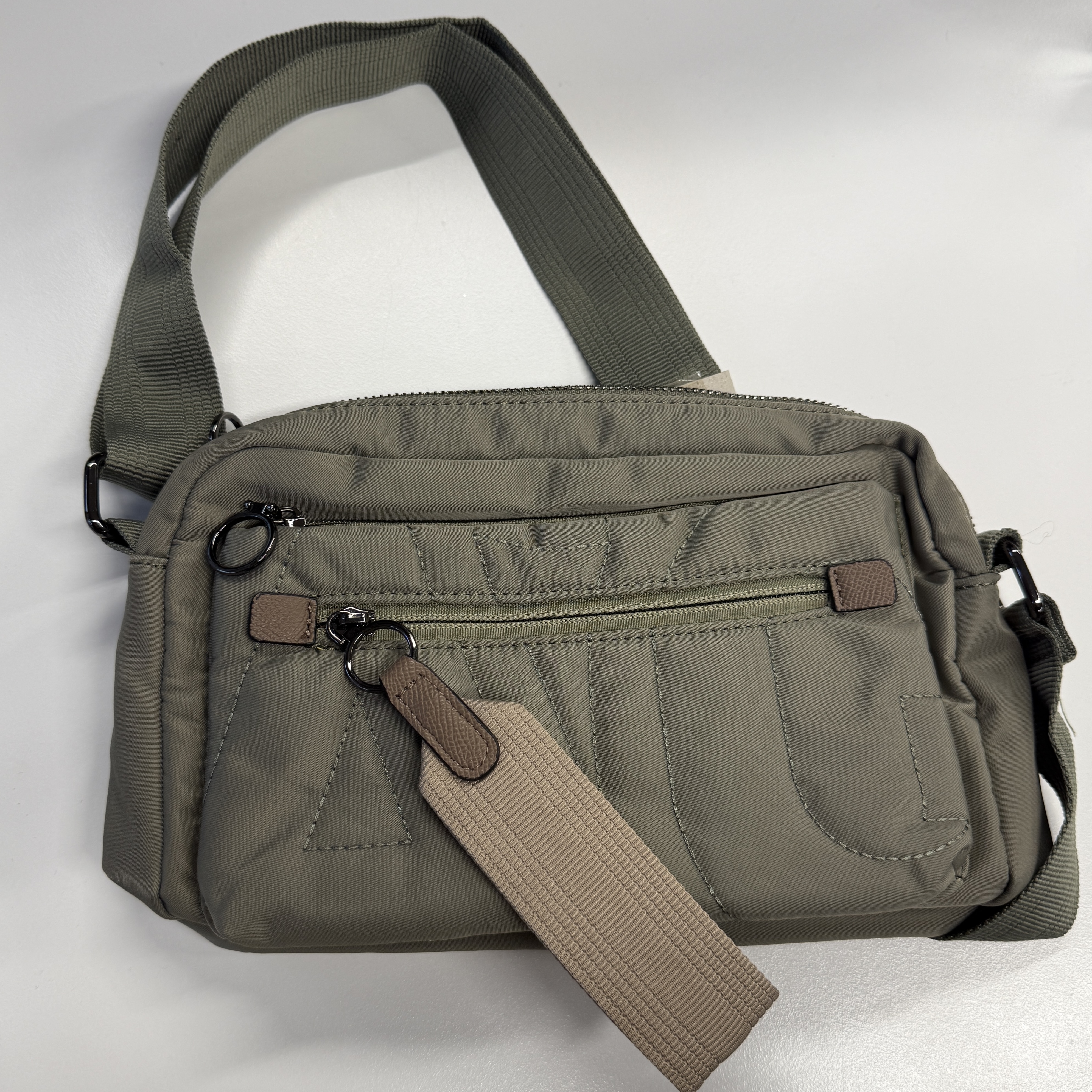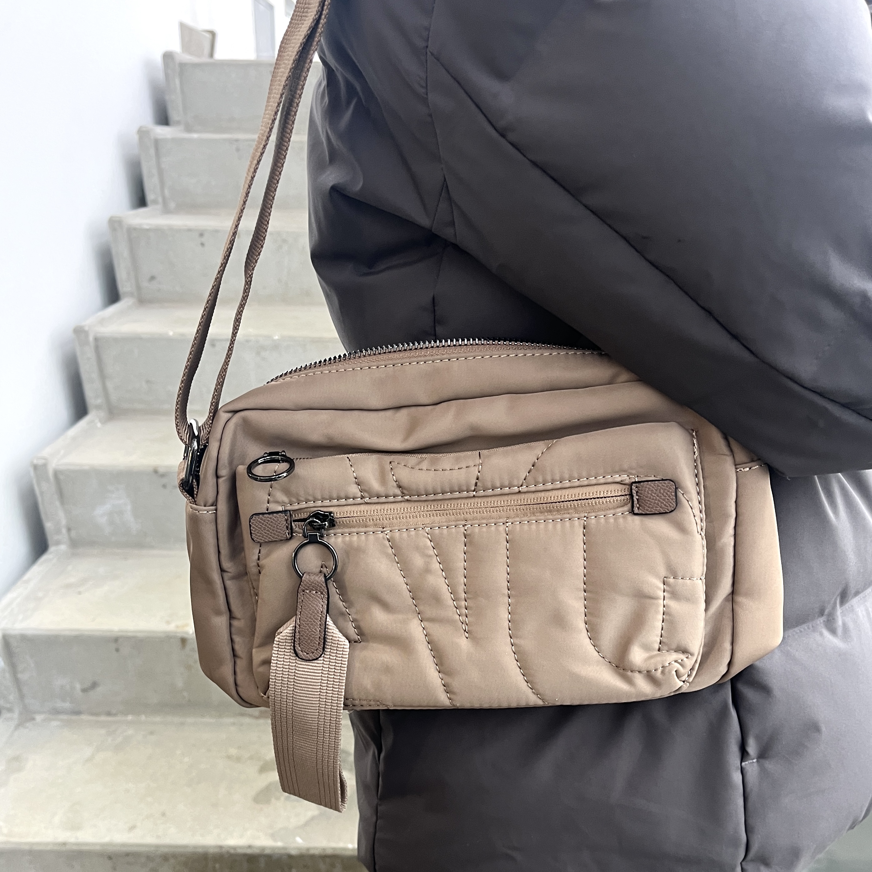 Crossbodyen har en lang justerbar rem og fås i  sort, beige, taupe, oliven og marine.