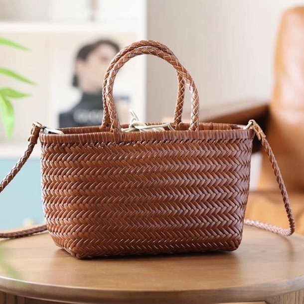 Crossbody / håndtasken har to hanke og en lang flettet rem, som er aftagelig