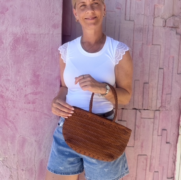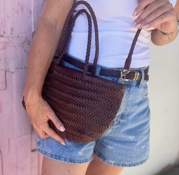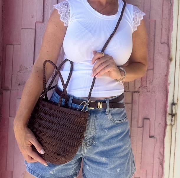 Denne skønne crossbody / håndtaske i flet fås i sort, brun, cognac og kaffe.