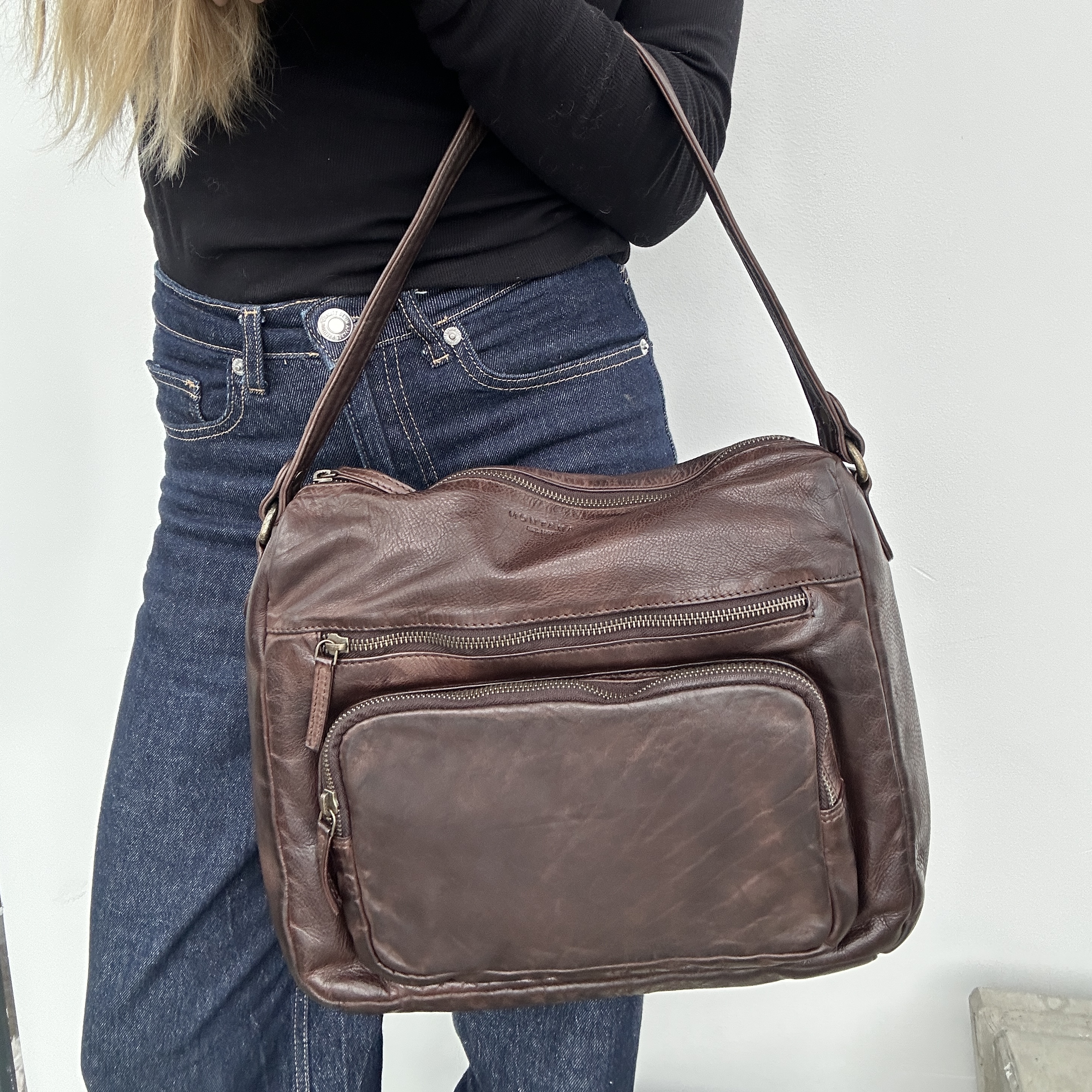 Rigtig fin stor crossbody i cogna og brun i vaske skind.
