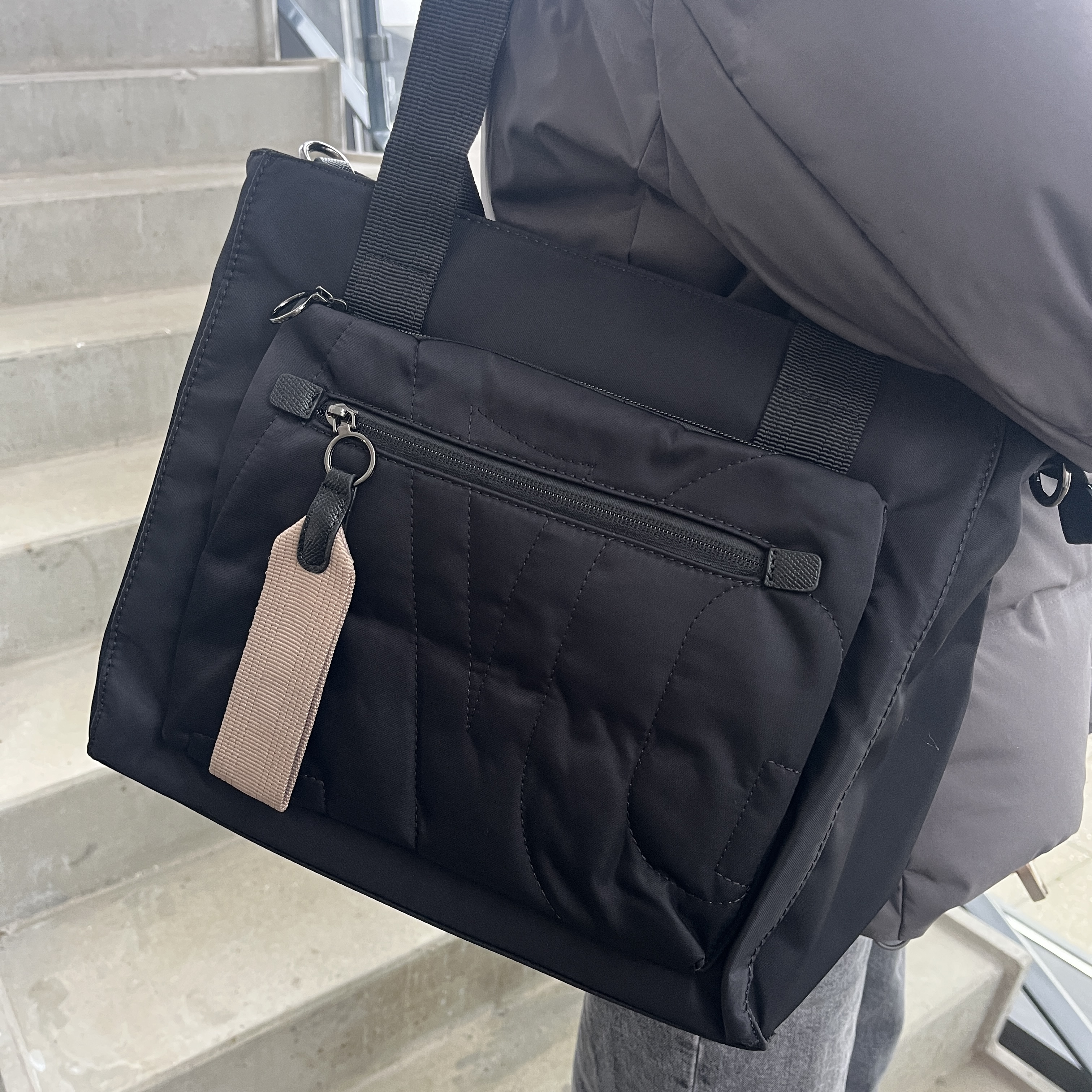 Denne mellem store crossbody har et stort hovedrum, som er opdelt i to af en lynlåslomme. I det forreste rum er der to stiklommer og i det bagerste er der en lynlåslomme. Foran har crossbodyen en quiltet forlomme, hvorpå der også er en lynlåslomme. Ligeledes har crossbodyen en lynlåslomme bagpå.