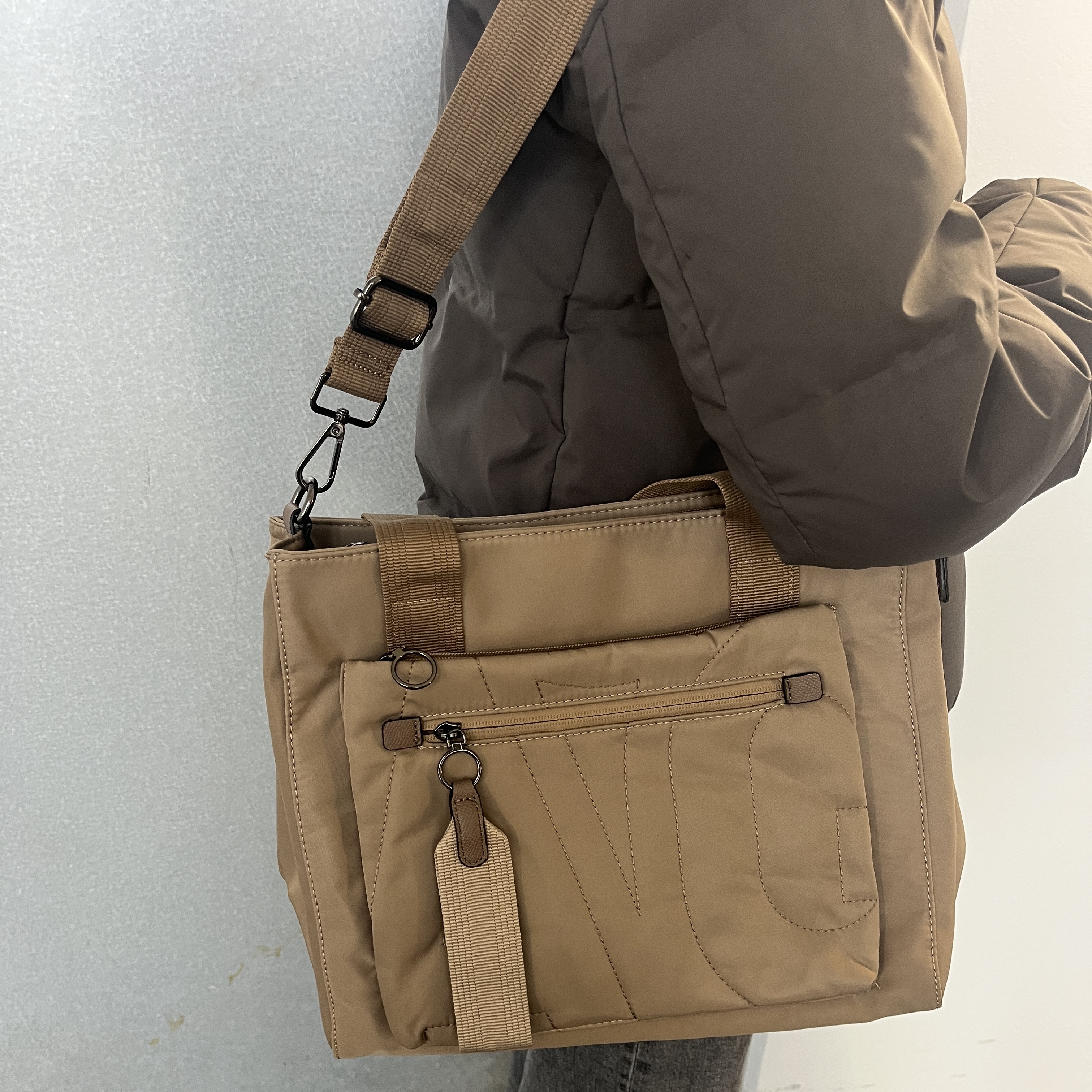 Crossbodyen har to hanke og en lang aftagelig justerbar rem og fås i beige, taupe og sort.
