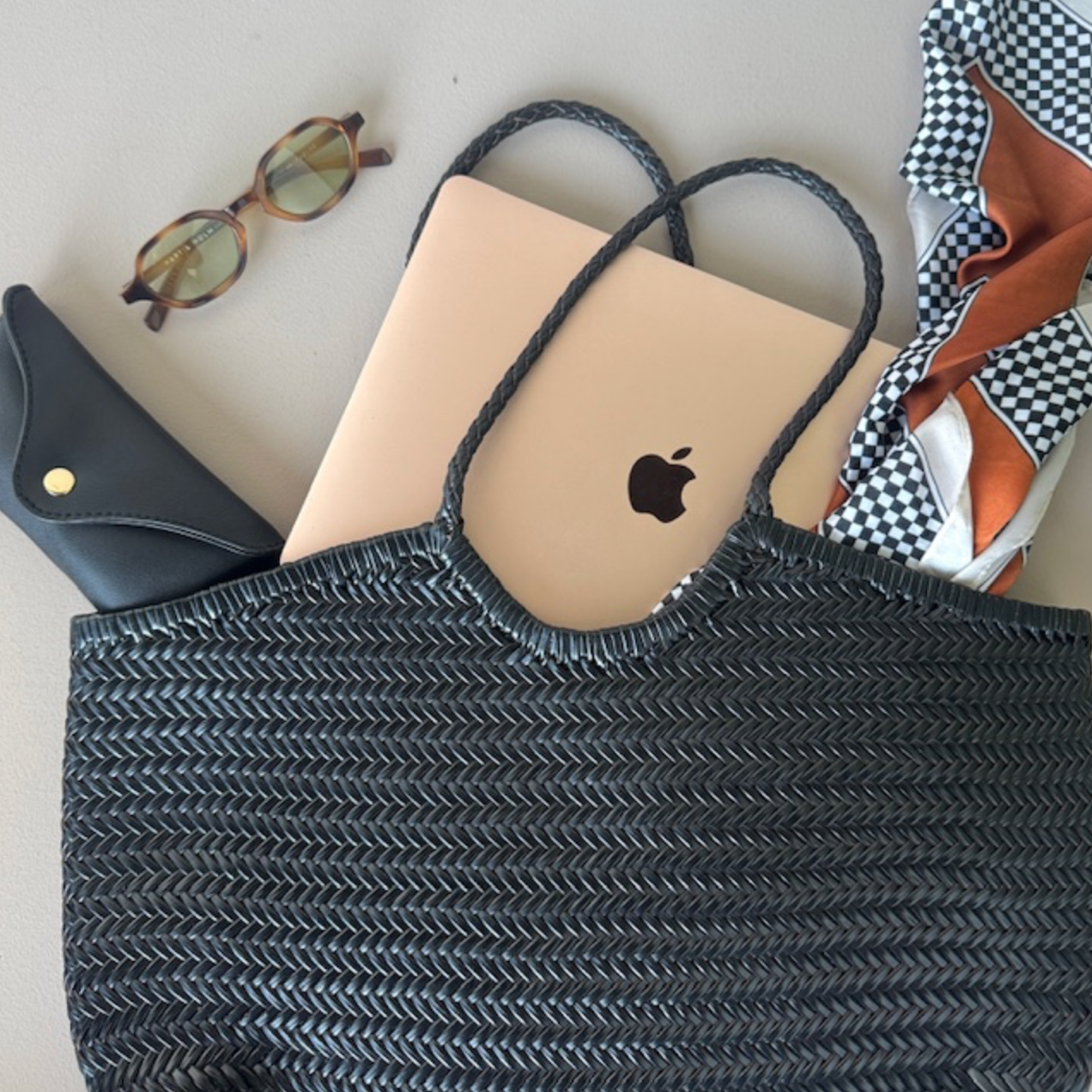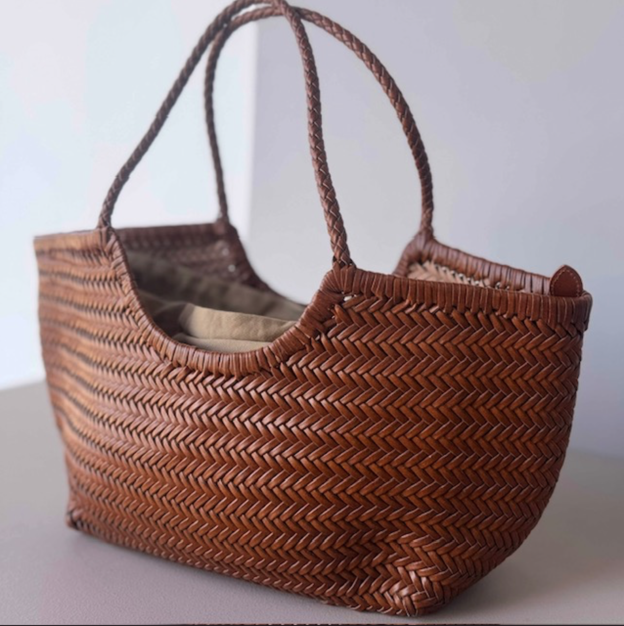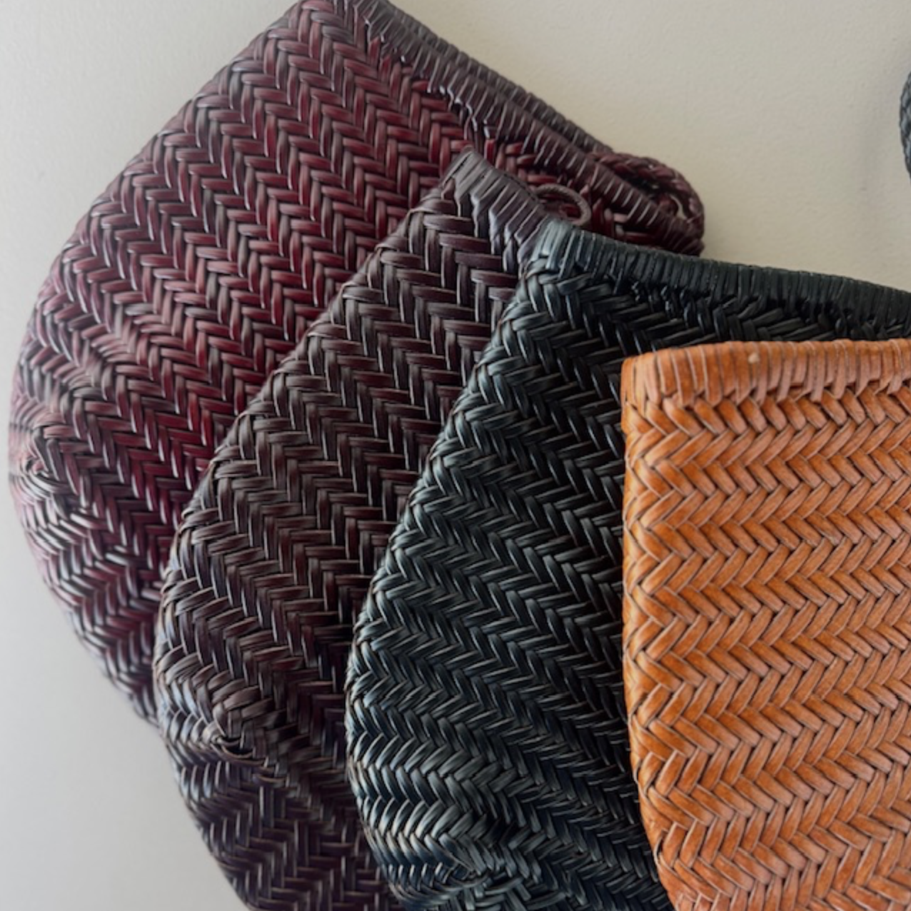 Skuldertaske i håndflettet skind i flere flotte farver.