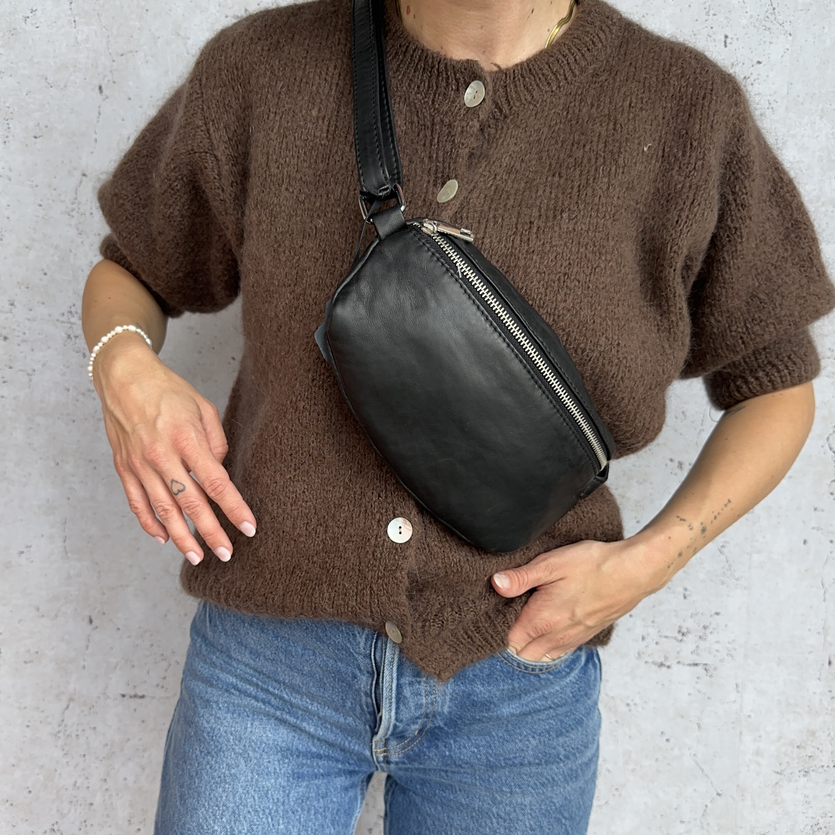 En rigtig fin lille bæltetaske i en lækker blød skind med et stort hovedrum, hvori der er en lynlåslomme.