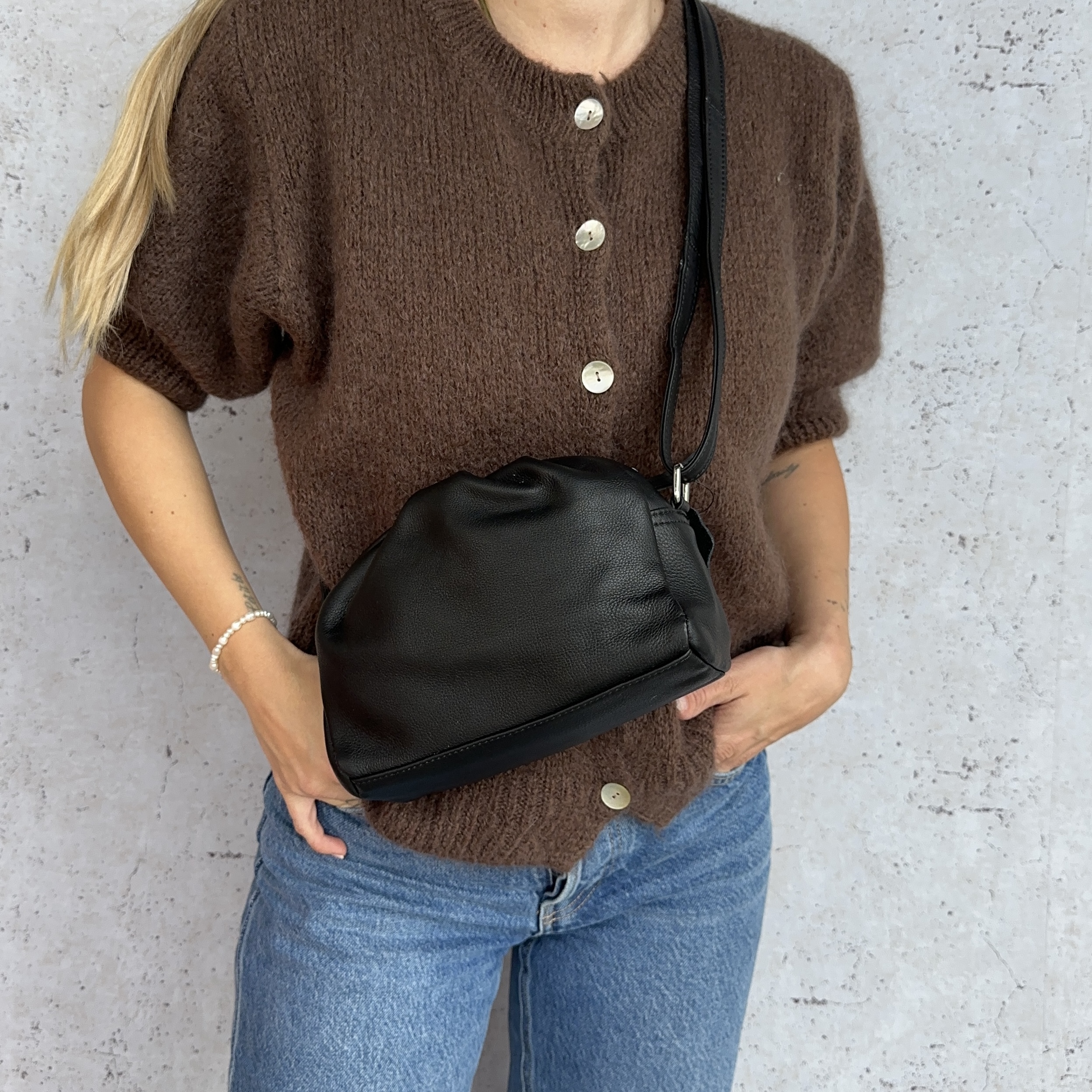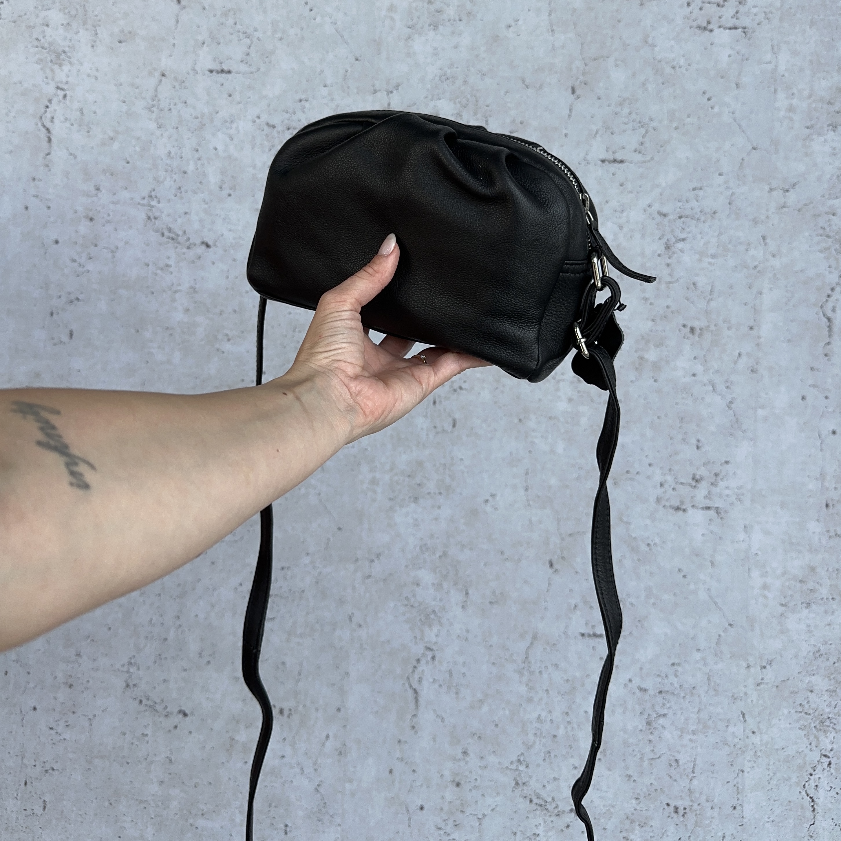 Crossbodyen er med rynke detaljer og har en lang justerbar rem og fås i sort.