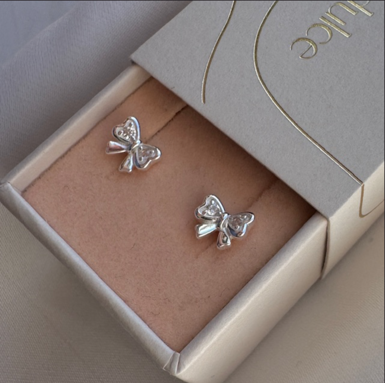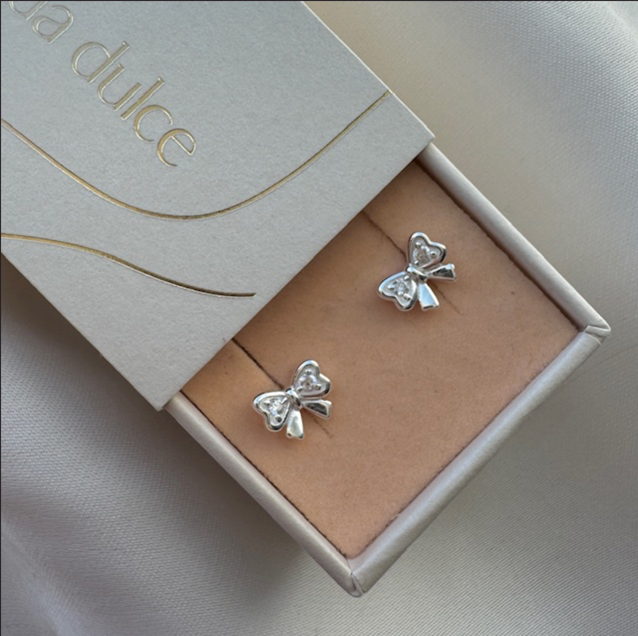 Små sterling sølv øreringe der ligner en lille sløjfe med lidt sten i.