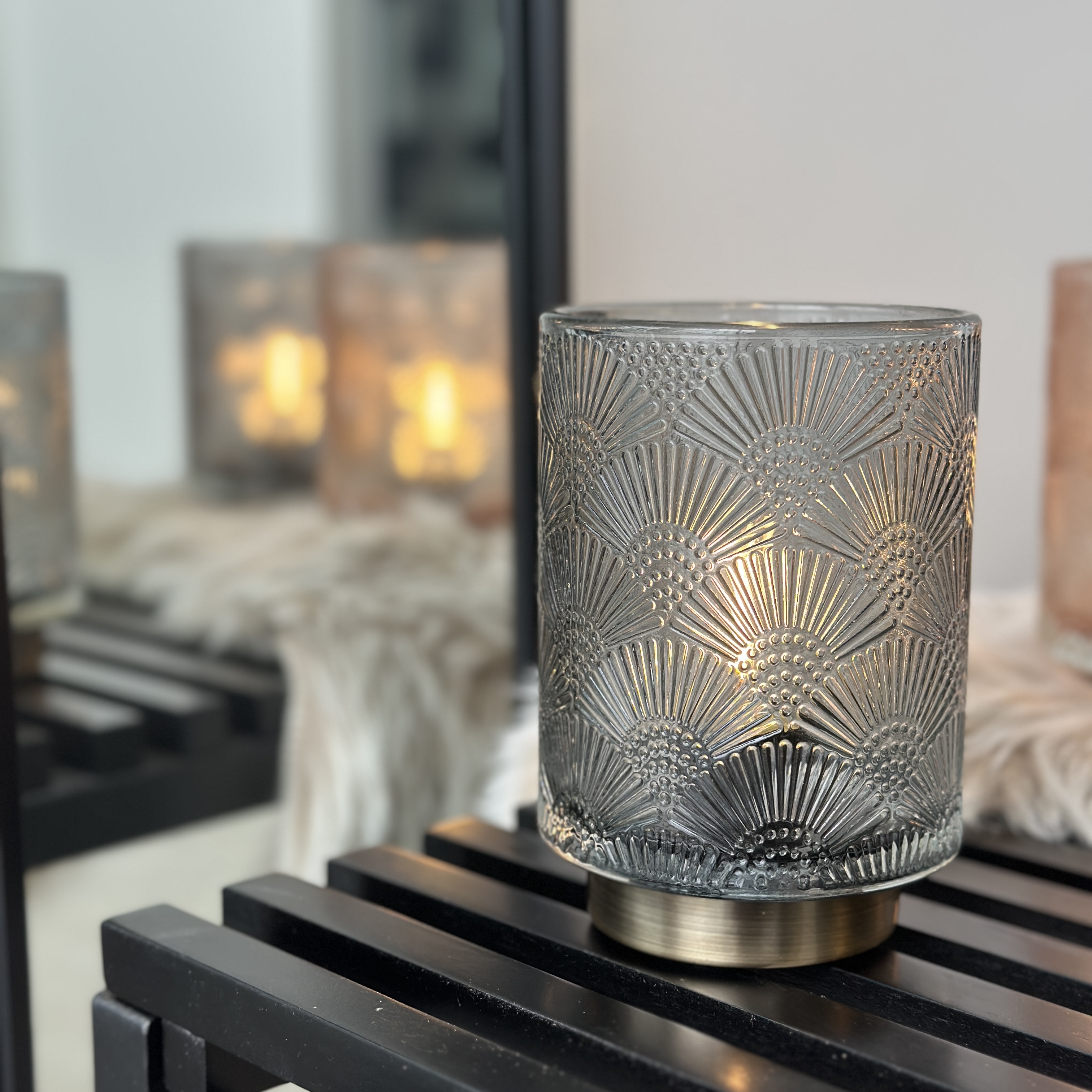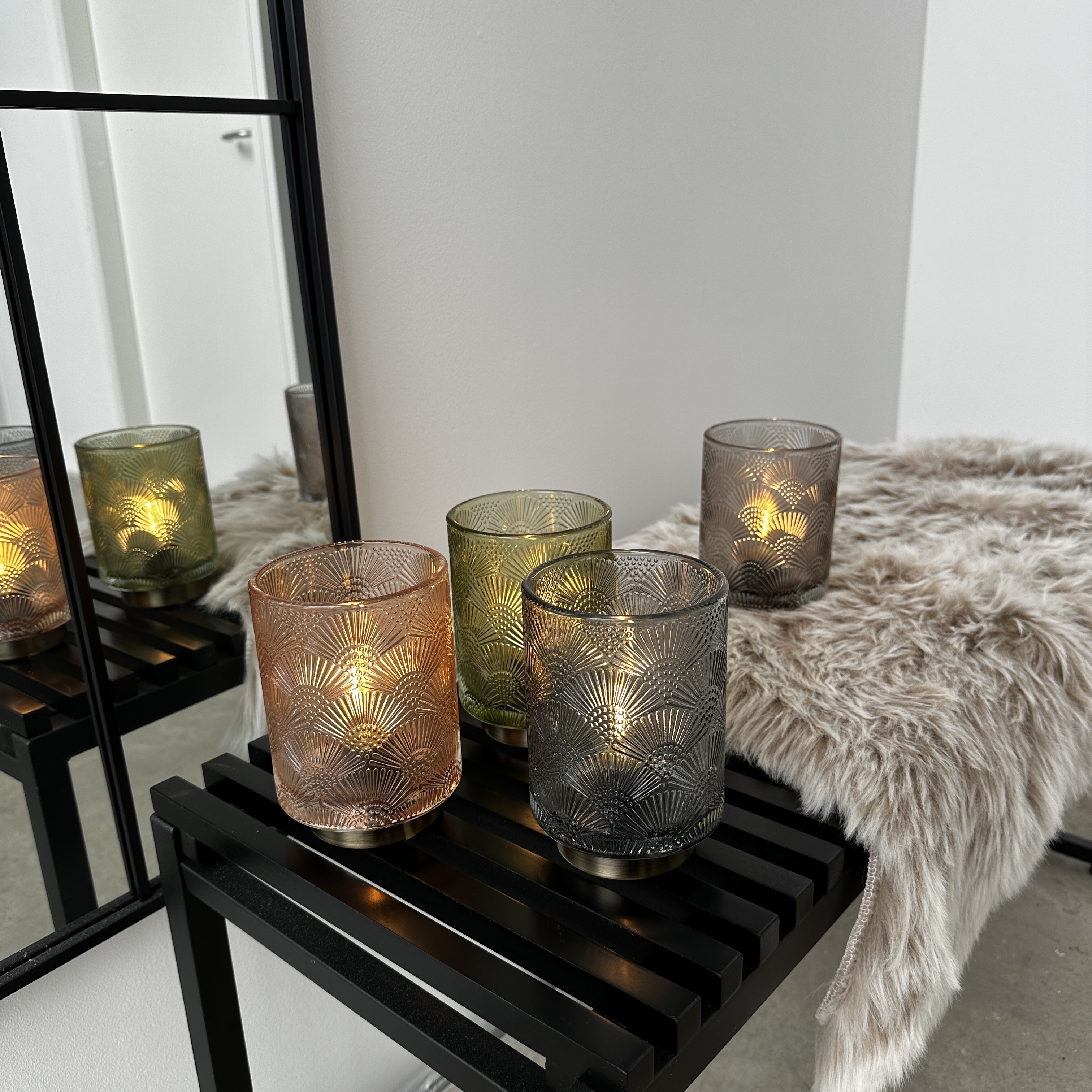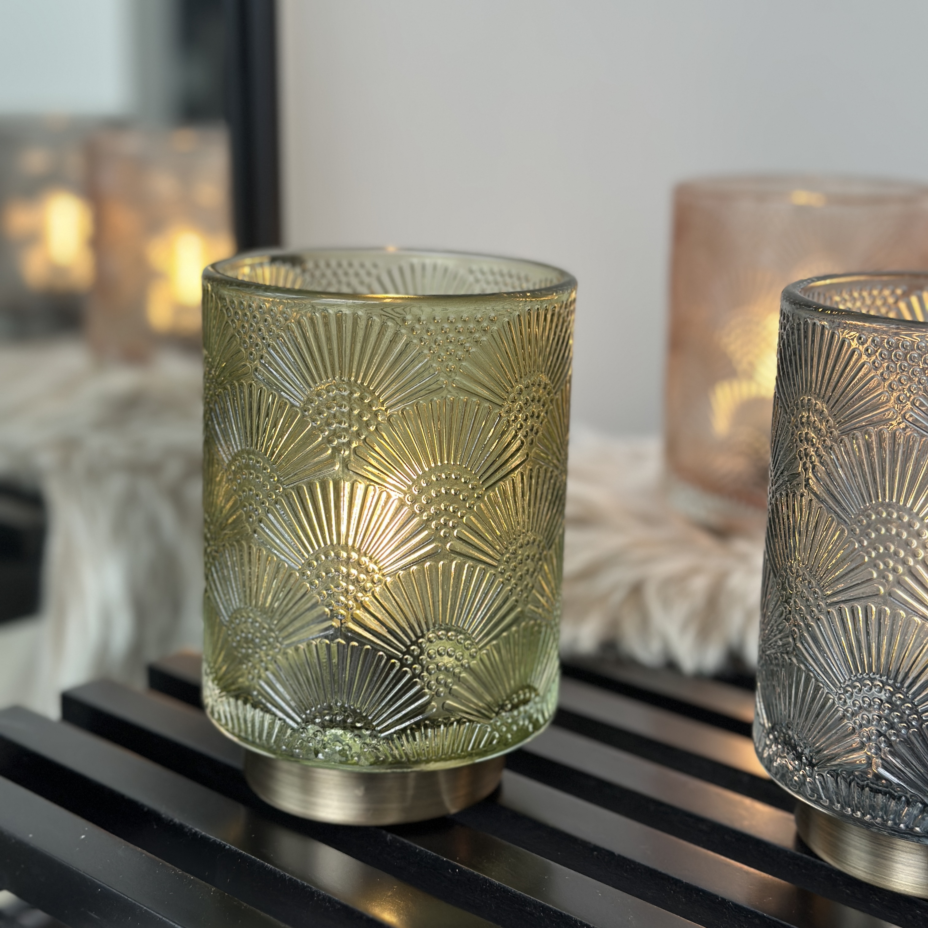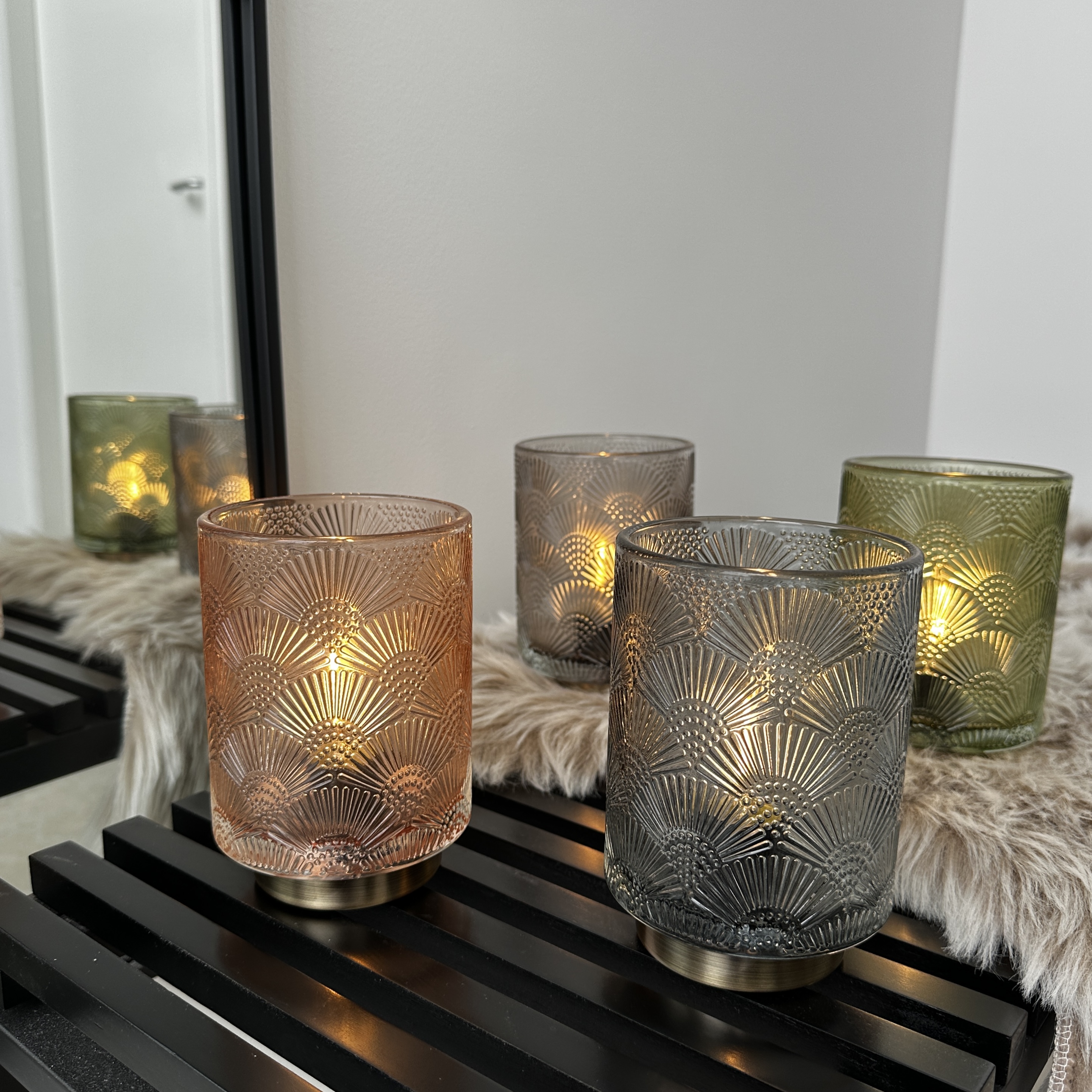 Denne smukke LED lampe har et fint vifte mønster i glasset. Lampen fås i 4 skønne varme farver: Blå, grøn, grå og rose. Den er med pære og bruger 2 x AAA batterier som ikke medfølger.