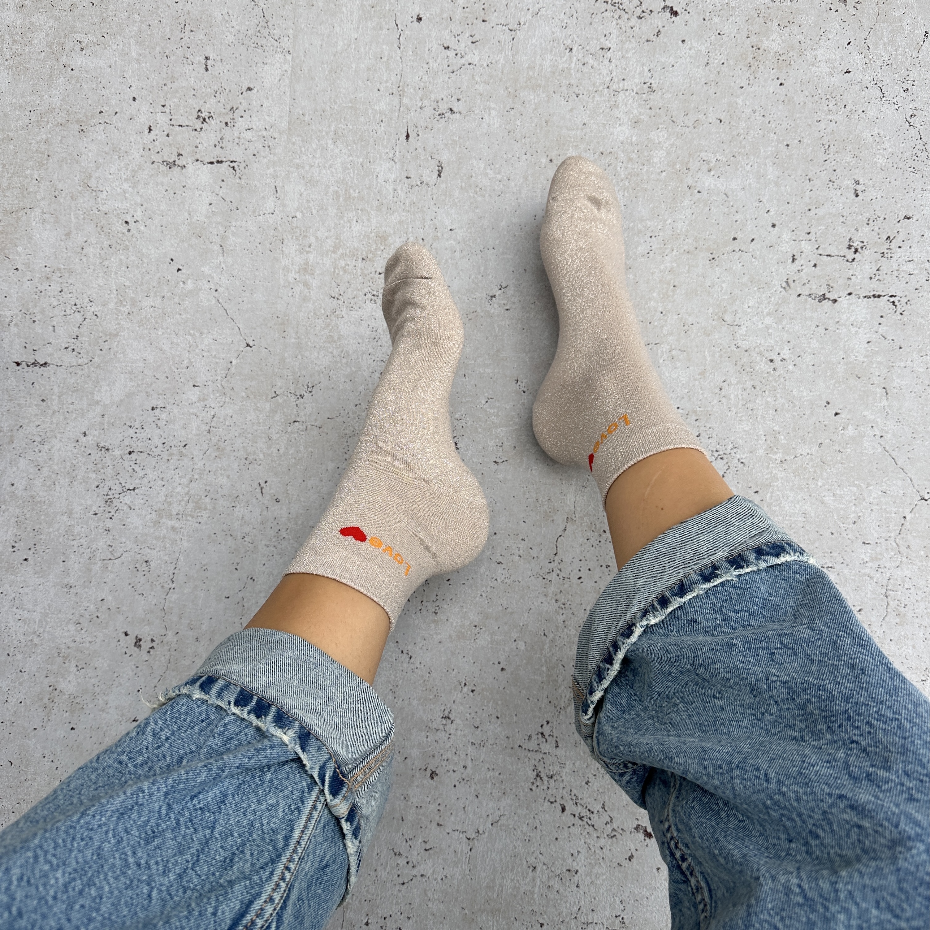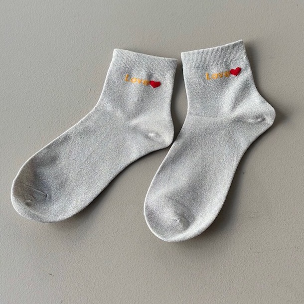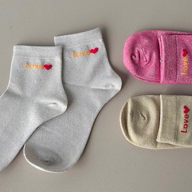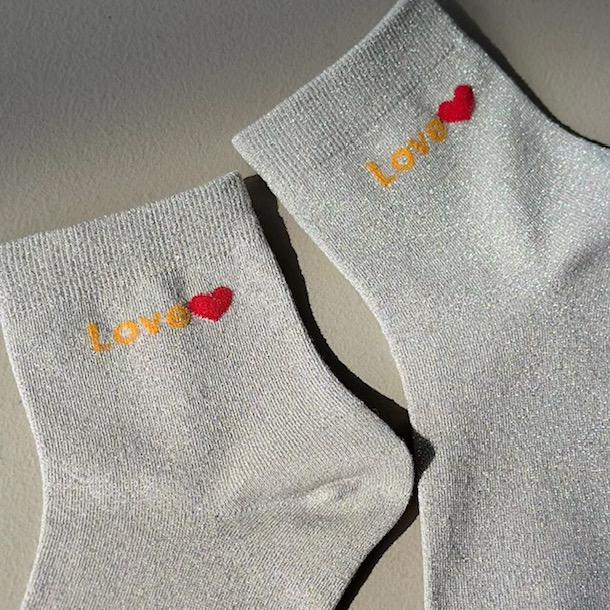 Flotte og lækre glimmer strømper med teksten Love og en rød hjerte.