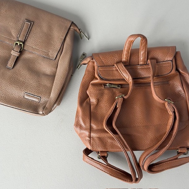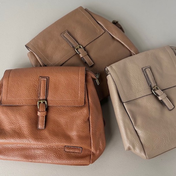 Denne skønne rygsæk i PU fås i cognac, beige og brun.