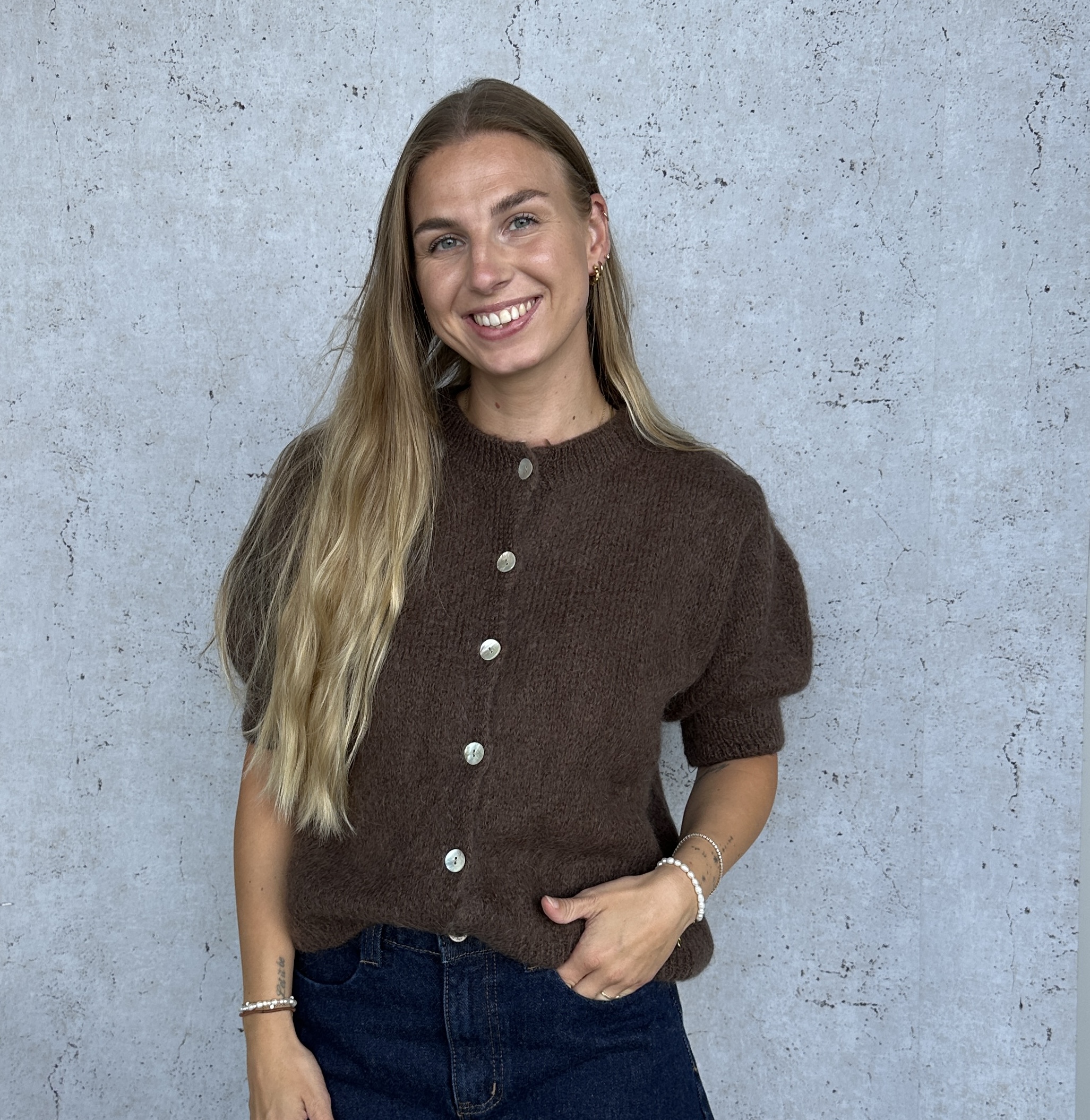 Denne mohair kortærmet cardigan sweater har rund hals og de flotteste knapper.