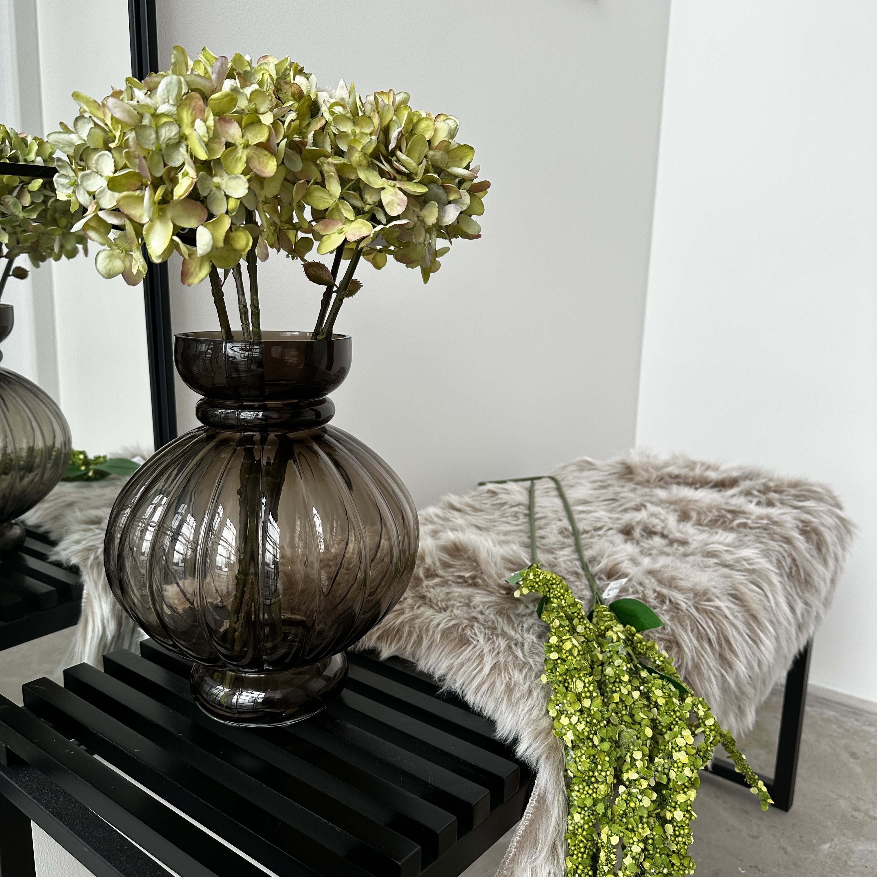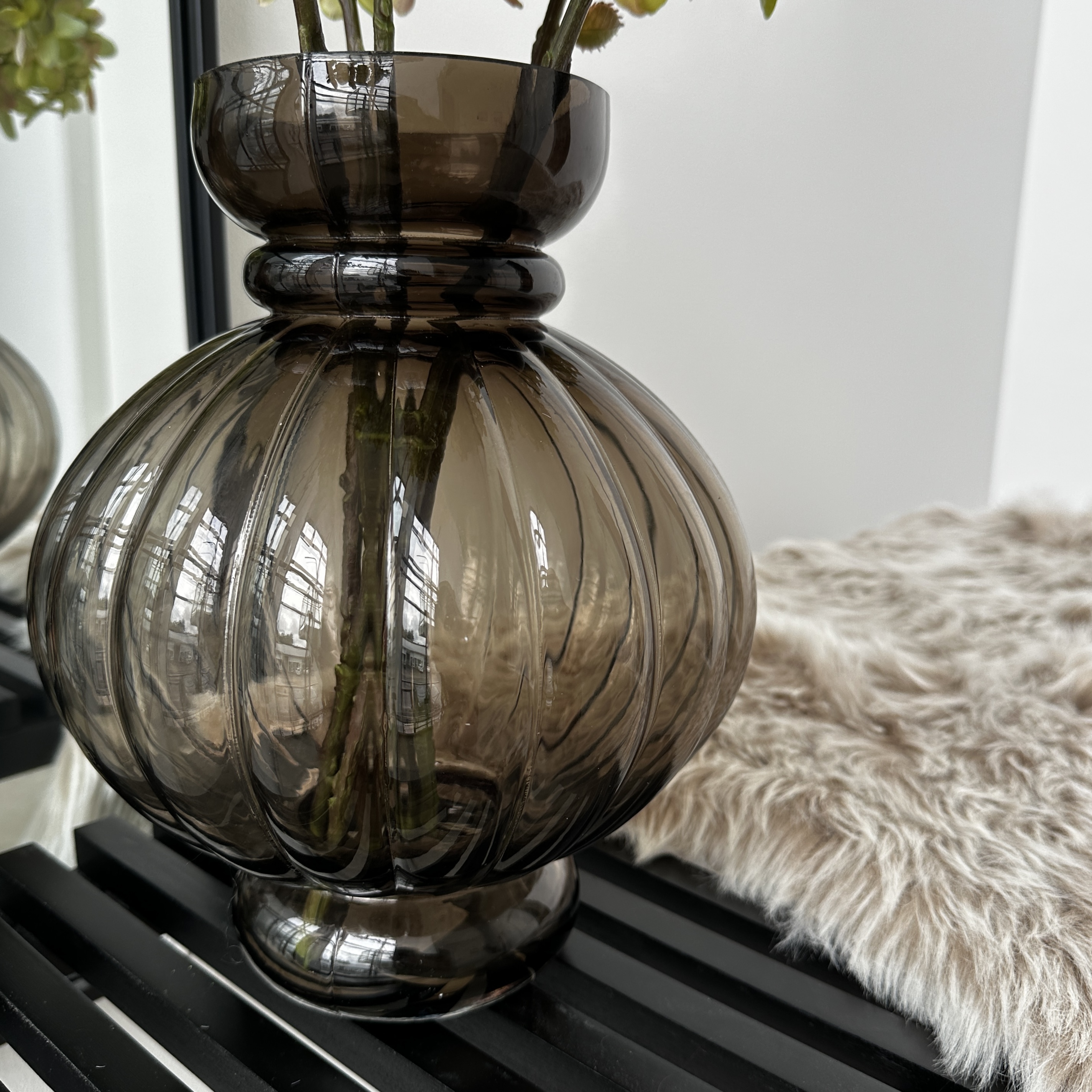 Denne smukke vase er i brun glas er buttet på midten med riller. Vasen kan sagtens stå alene uden blomster, men er super fin med nogle af vores kunstige blomster eller grene i.