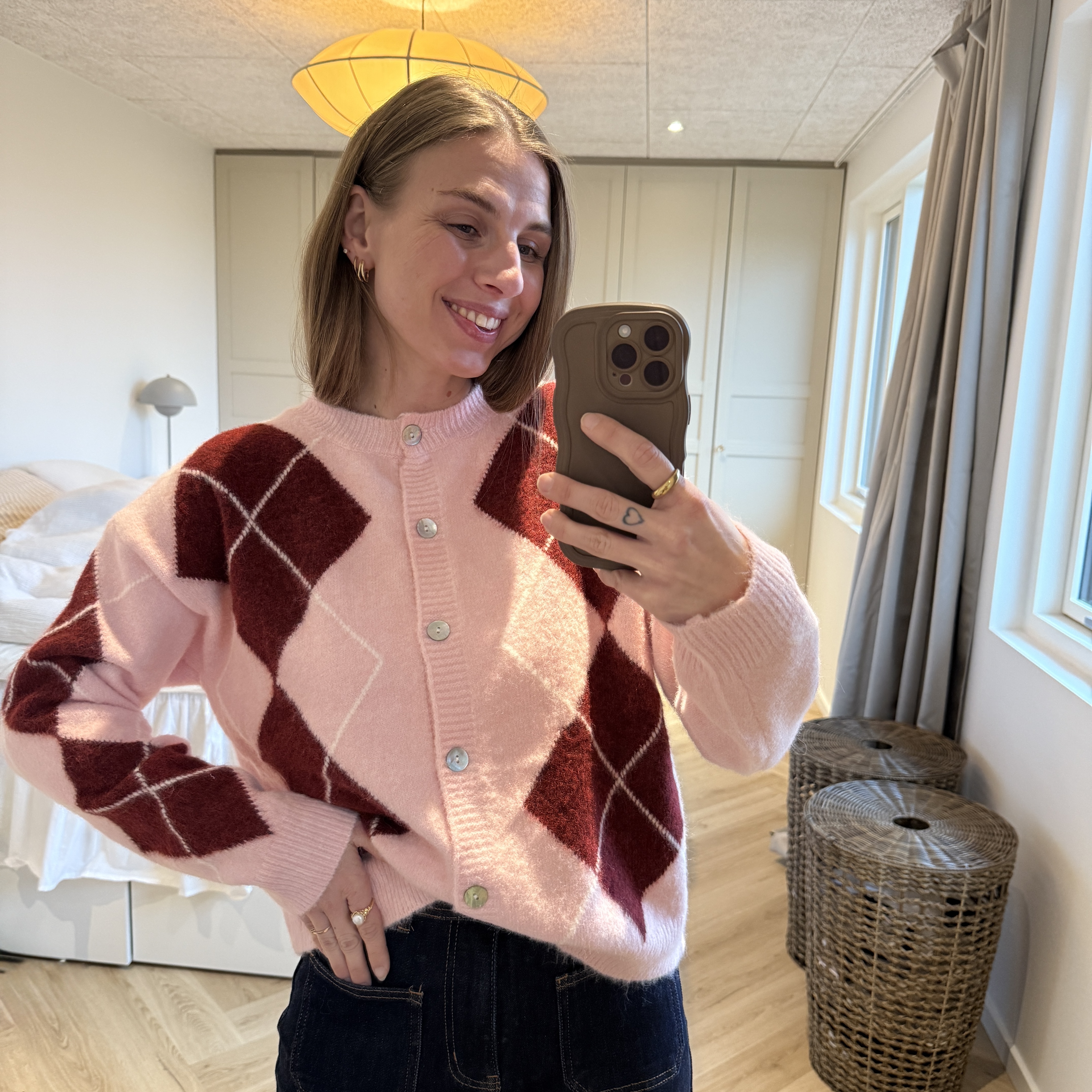 En blød strik cardigan i must have mønsteret denne sæson, nemlig aergyle. Den er i forårs fine pasteller, præcis de farver trenden tager med ind i moden og garderoben dette forår. Dette preppy mønster er her i de perfekte forårs farver, og et mønster man ikke kan få nok af denne sæson.