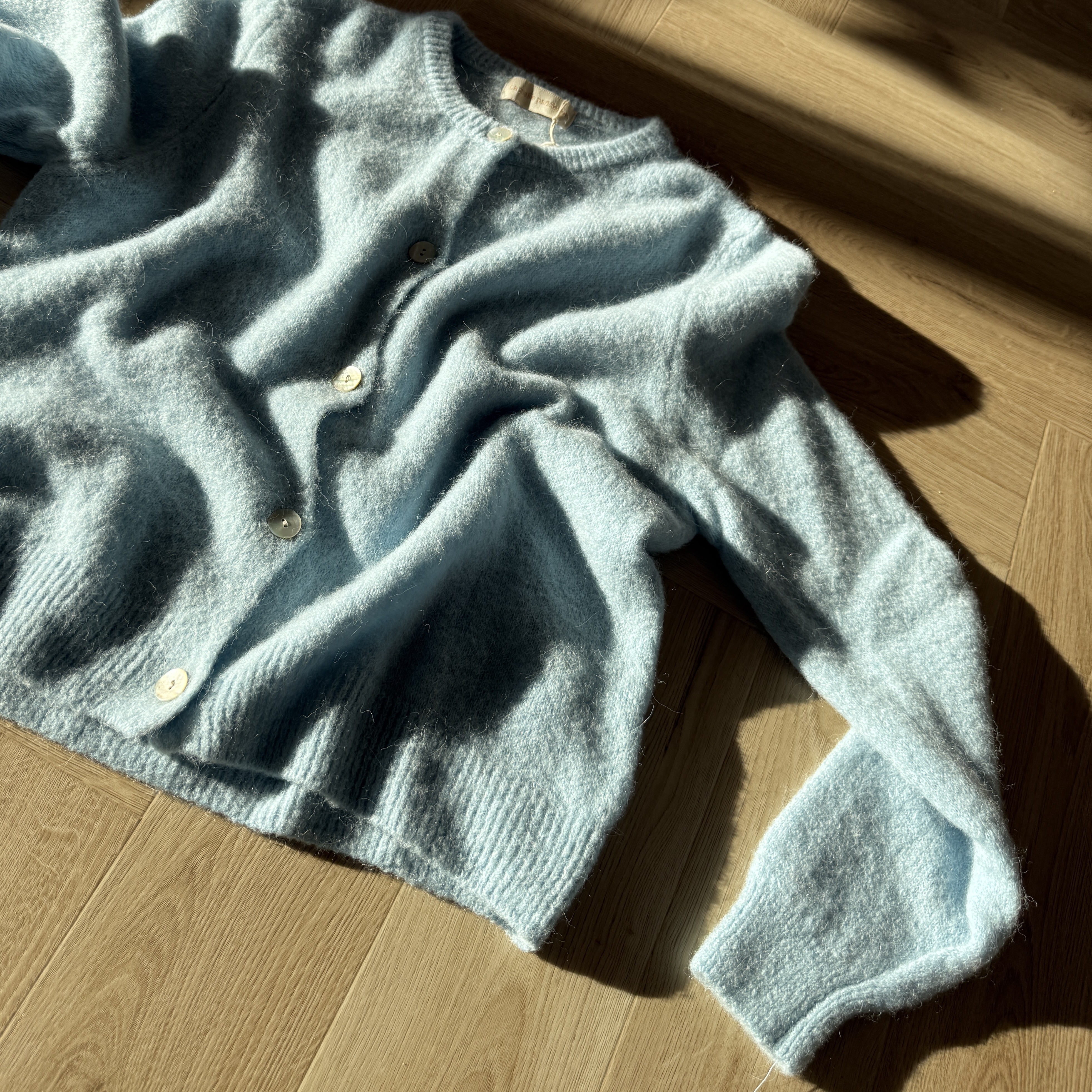 Exceptionel cardigan i superfin alpaka, en naturlig fiber kendt for sin uovertrufne blødhed og lette varme. Den runde halsudskæring giver et tidløst og elegant look, der gør cardiganen perfekt til alle årstider.