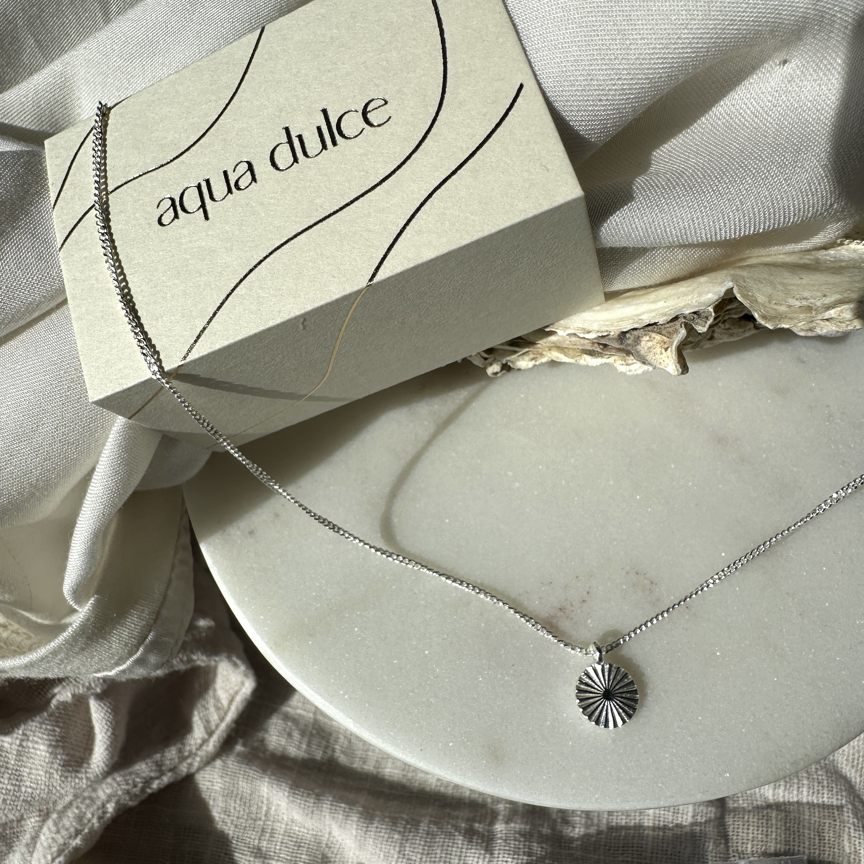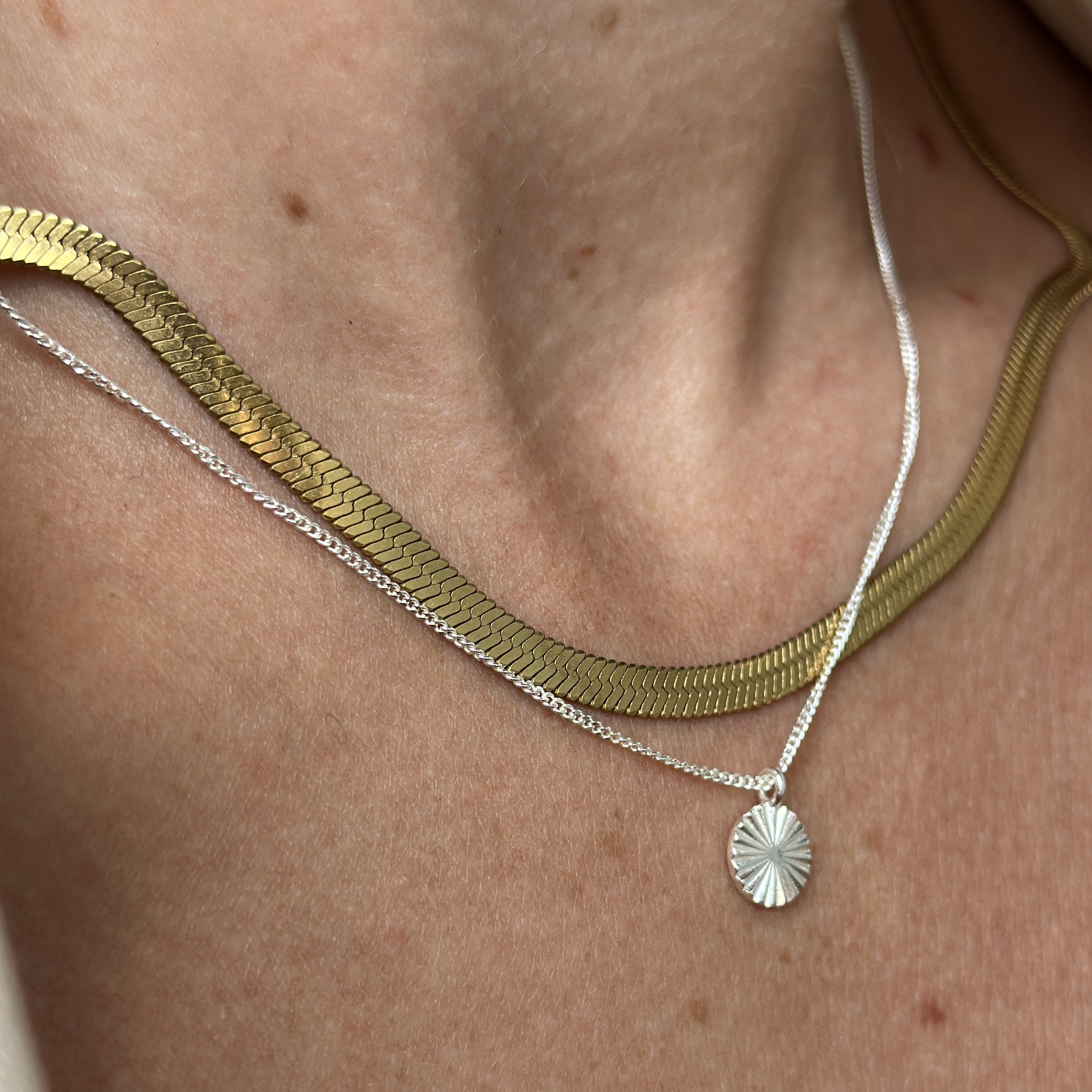 En halskæde i et klassisk design med et lille mønt vedhæng med riller..
