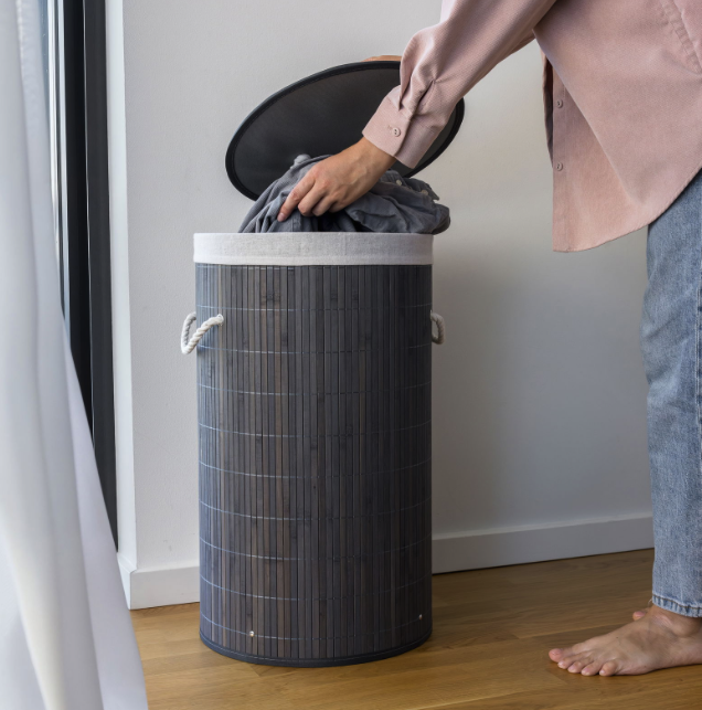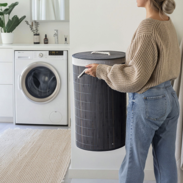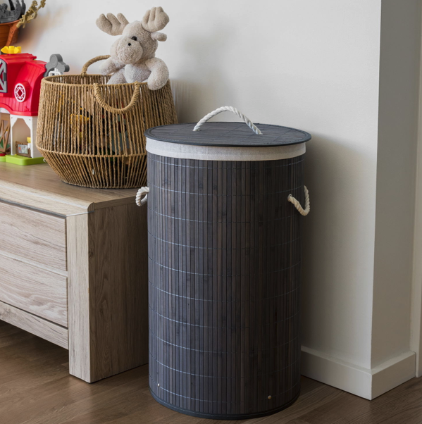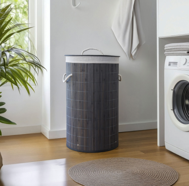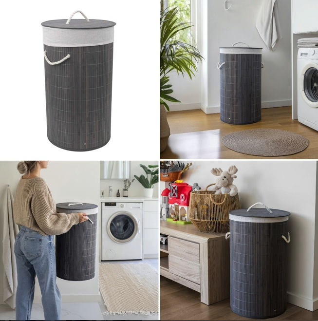 Denne elegante grå bambus vasketøjskurv kombinerer praktisk funktionalitet med et moderne og naturligt look, der passer perfekt i både badeværelse, bryggers eller soveværelse. 🌿✨
