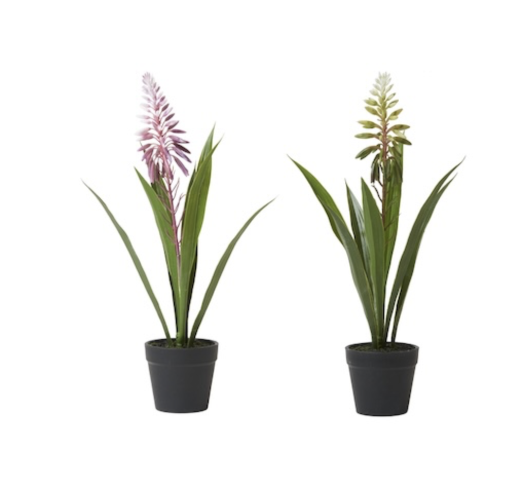 Supper fin kunstig aloe plante ed blomst i hvid og lilla i 8 cm potte.