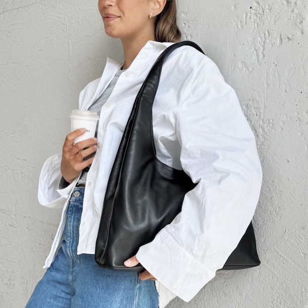Skuldertasken har to hanke og fås i sort.