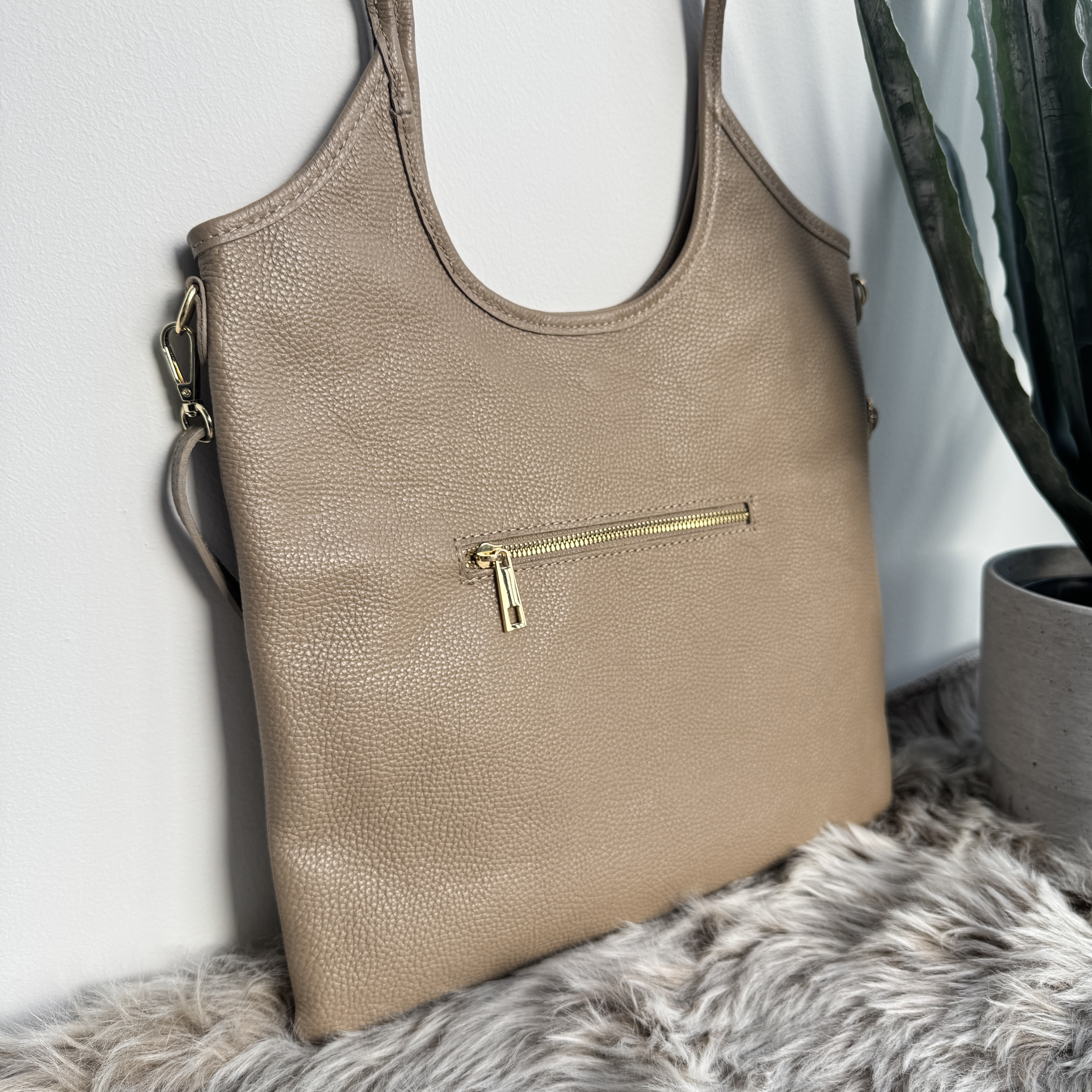 Denne super cool skuldertaske har et stort hovedrum, som lukkes med en magnetknap. Indvendig er tasken opdelt i to af en lynlåslomme. Bagpå har skuldertasken ligeledes en lynlåslomme. Skuldertasken har to skulderstropper og en lang aftagelig justerbar rem, så du også har mulighed for at bruge tasken som en crossover. Skuldertasken fås i sort og beige.
